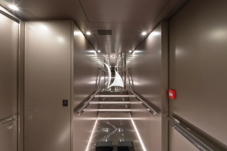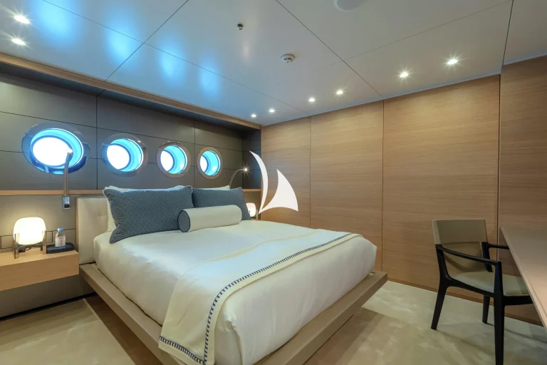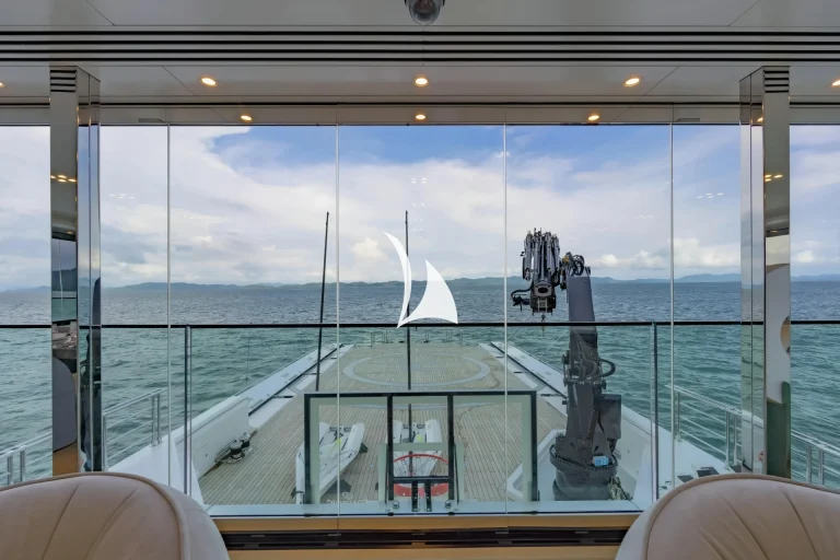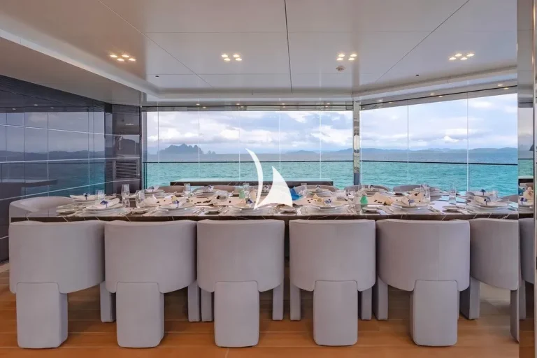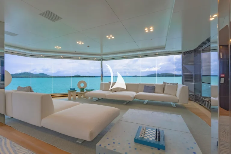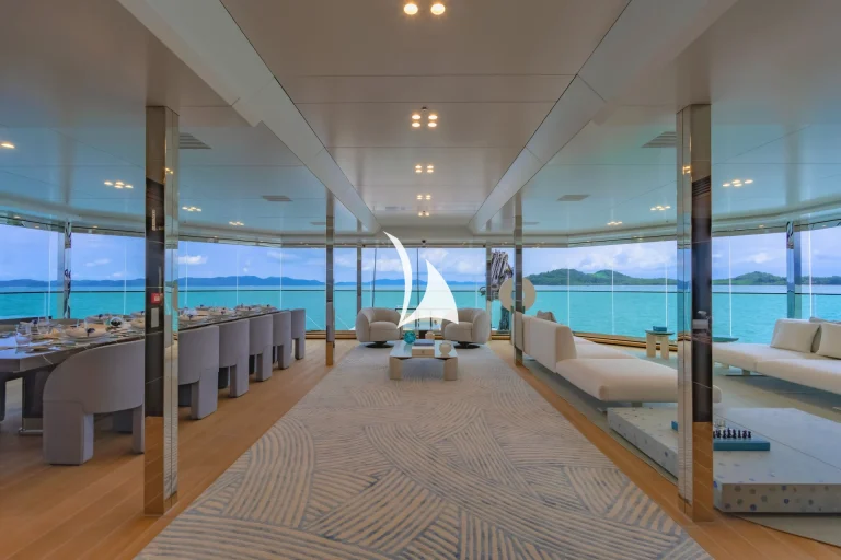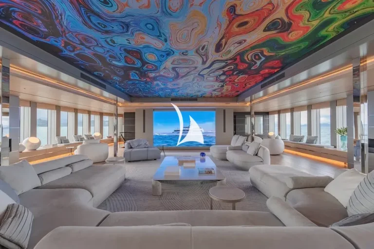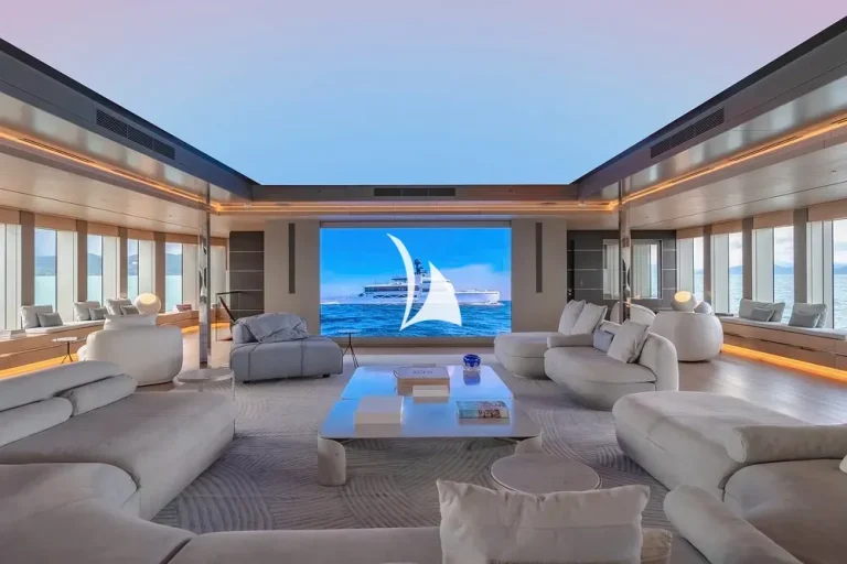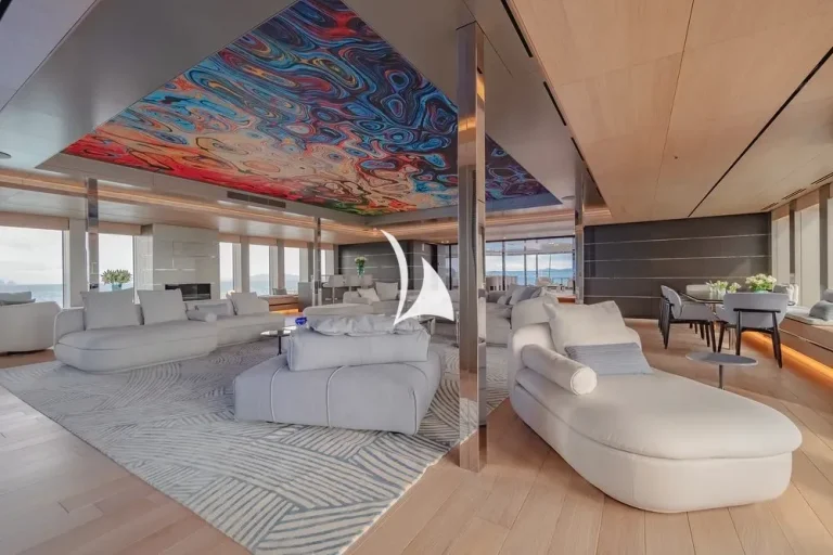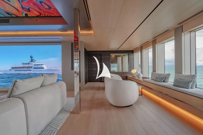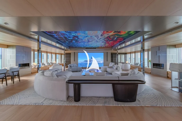 One of the most remarkable feature of this yacht and the widest part of it: The Loft. This is a winter garden space with floor-to-ceiling privacy glass that slides away to create a remarkable open-air shaded terrace. t’s aft of the high-ceiling sky lounge with huge screen on which guests can enjoy sports, movie nights and highlights of the day’s filmed adventures. The ceiling itself is a huge screen, like those in The Loft and the heli-hangar, that can display any image or video you want – you can even bring the Northern Lights inside should you wish.