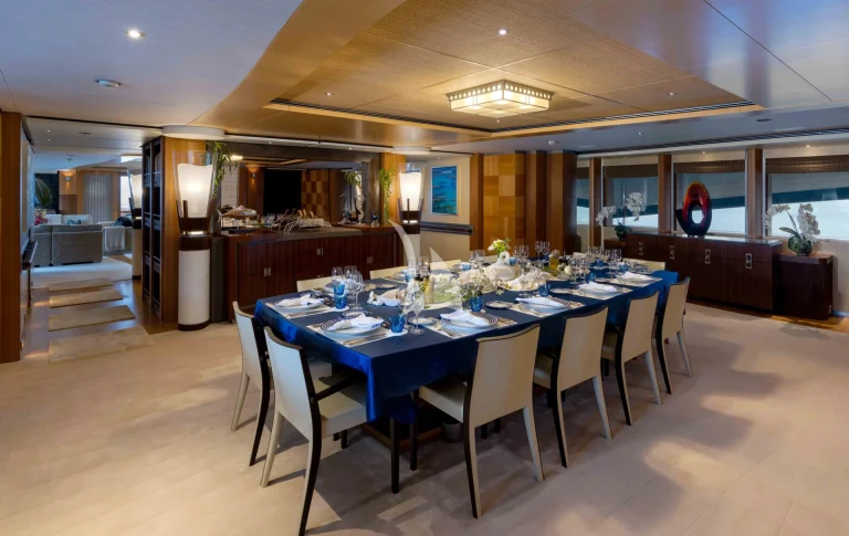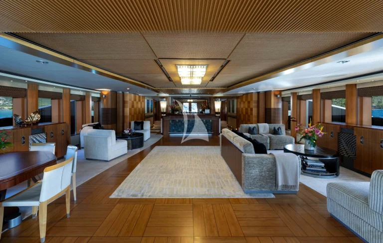 – Main salon isn’t just used as a disco area – it fully converts into one with ceiling panels retracting to reveal the full gambit of disco lights and side wall units opening up to reveal the yacht’s very own smoke machines.