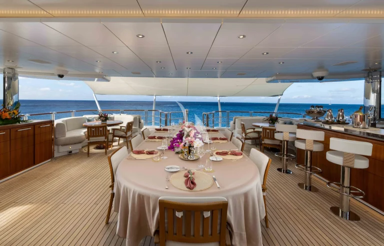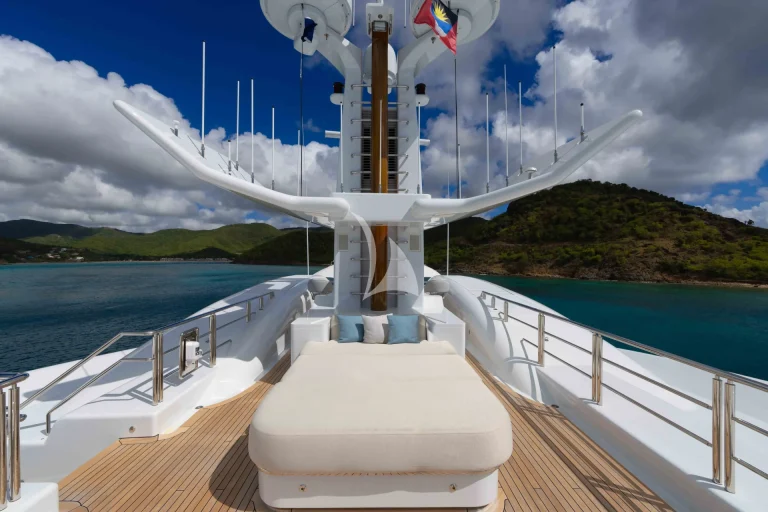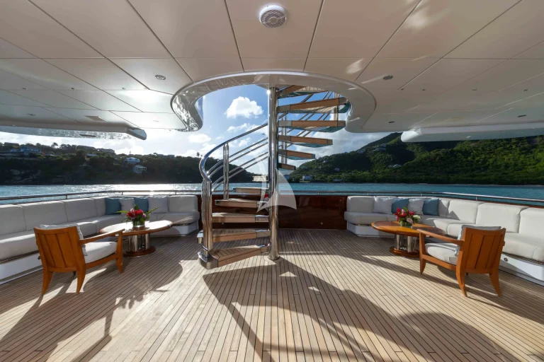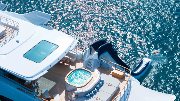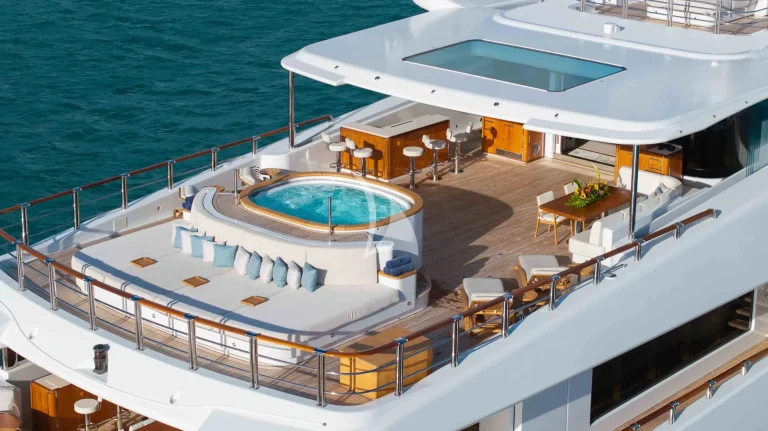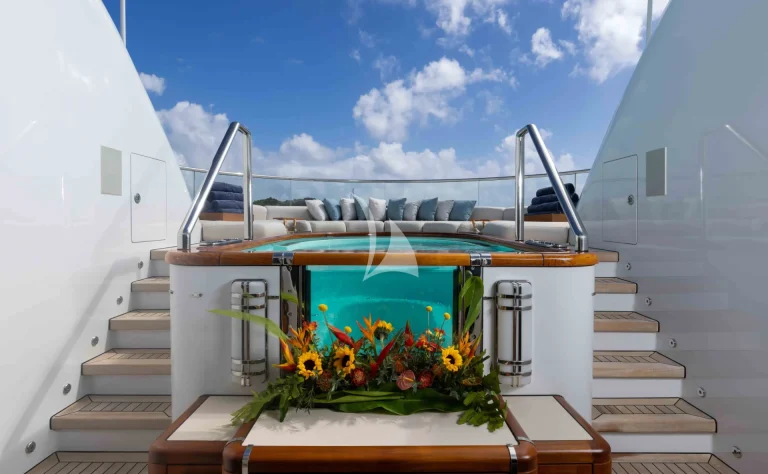 – Sundeck features a vast sunbathing and lounging area aft and a cozy relaxing nook with Jacuzzi forward – also ideal for al fresco massage treatments
