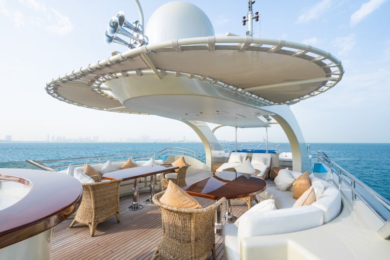 – Two master cabins, one located in the main deck with contemporary interiors including a large media/office area and the second in the upper deck with a private terrace.