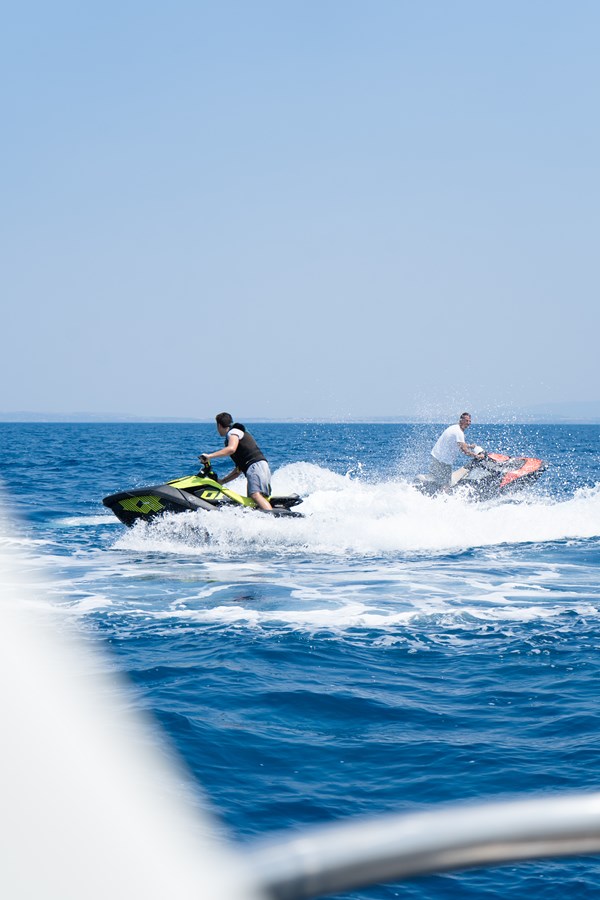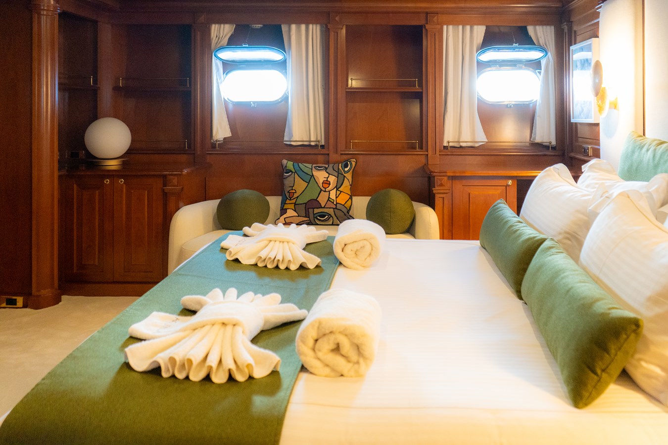 She measures 37 meters in length, with a steel hull and aluminium superstructure, designed to provide smooth sailing even in the roughest seas. The yacht comfortably accommodates up to 12 guests across five en suite cabins, including two full-beam master cabins (one located on the main deck), one VIP cabin, and two twin cabins with Pullmans.
