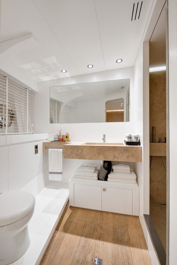 SY Atlantika accommodates up to ten guests in five staterooms. The full width master suite is situated at the bow. It is bright, spacious and fitted with a king-sized bed, a separate seating area, a vast closet space and ensuite bathroom. The double and the twin staterooms have vanity units, good size closet spaces and en suite bathrooms. The smart configuration offers flexibility to suit all kinds of groups on board. By offering one of the largest living rooms in it’s class, gives her guests the opportunity to enjoy indoors dining and home theater experience without any compromise. The living space is decorated with Top level Italian furnitures and fixtures.