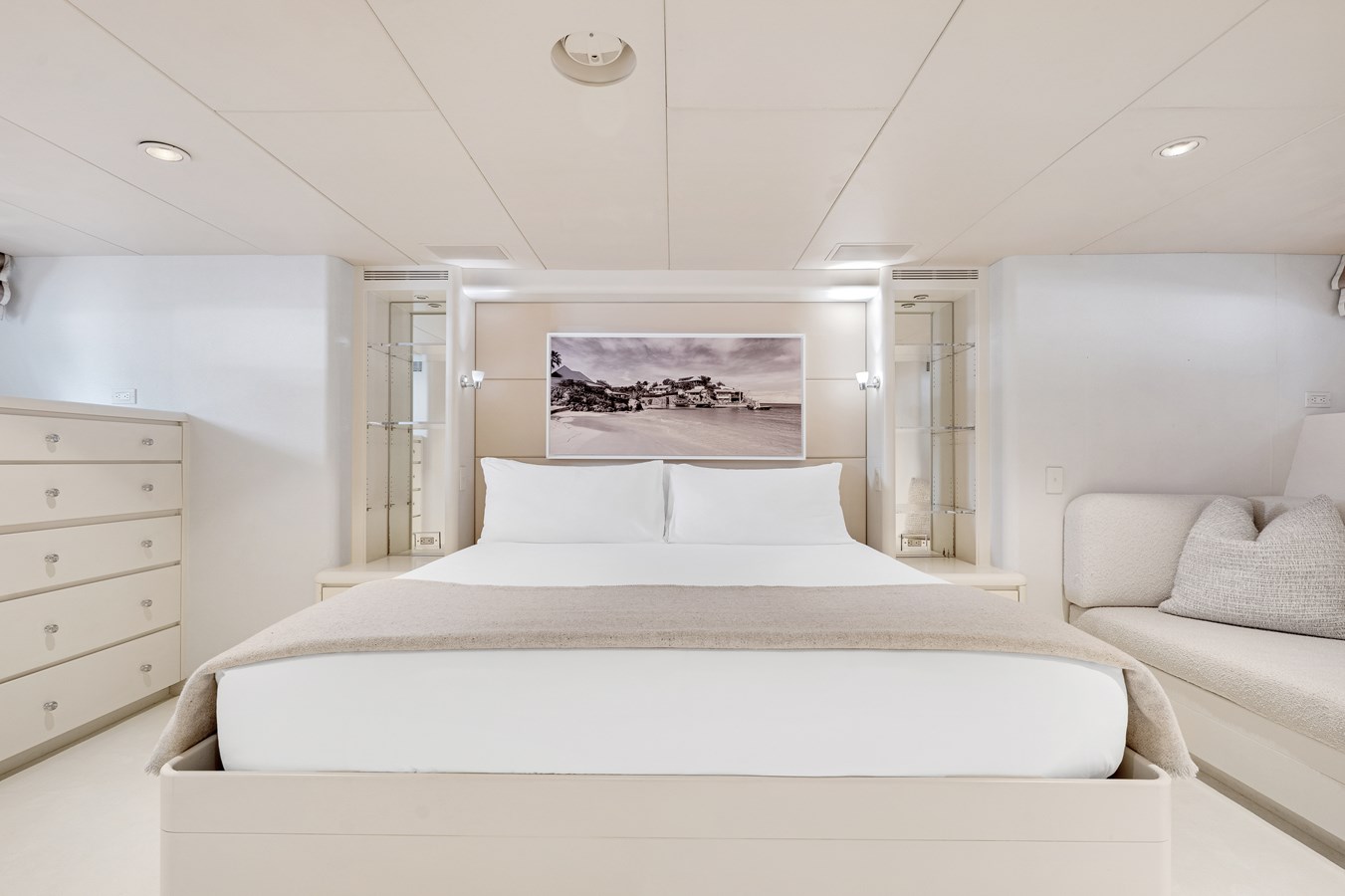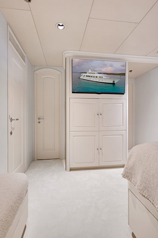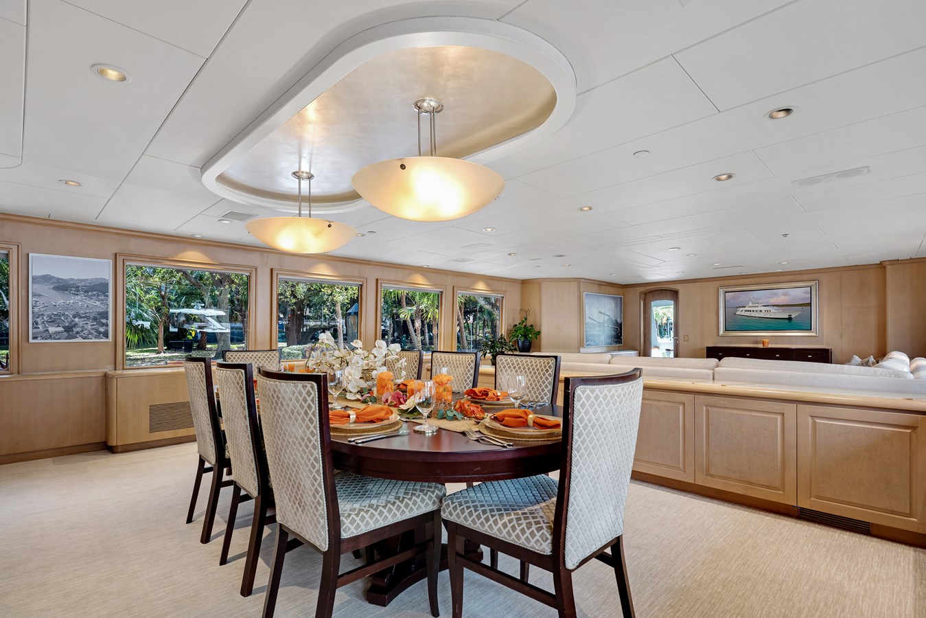 Chanson is a spacious 120′ Tri-Deck Motor Yacht, built to ABS standards by Christensen Shipyard in 1995. Her wide beam provides generous living areas on the main and upper decks, featuring walk-around side decks. The yacht offers a four-stateroom layout, including an on-deck VIP suite and a full-beam master stateroom on the lower level. The expansive salon and dining area lead to a semi-enclosed aft deck with seating overlooking the cockpit. The upper deck features a Captain’s suite behind the pilothouse and a skylounge with a full wet bar near the boat deck, while the top deck offers additional seating and a large hot tub.