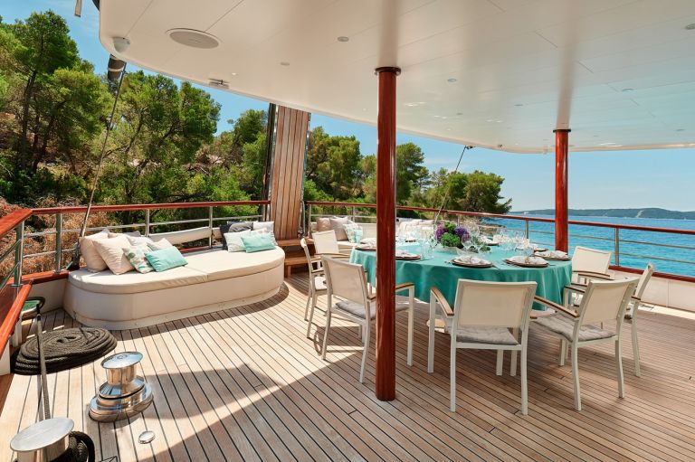 On her 8m wide aft deck, two huge sunbeds overlook a wonderful “al fresco” dining area for up to 12 guests, while the fore deck also offers two attractive lounges with an amazing sea view. Her sundeck provides two separate lounges areas – upper aft lounge with large sunbeds, jacuzzi, sauna and dayhead; and beautiful upper fore lounge with sunbeds which offer stunning 180° view. A 6m bowsprit adds style to her elegant sailing style design, while improving her sailing performance.
