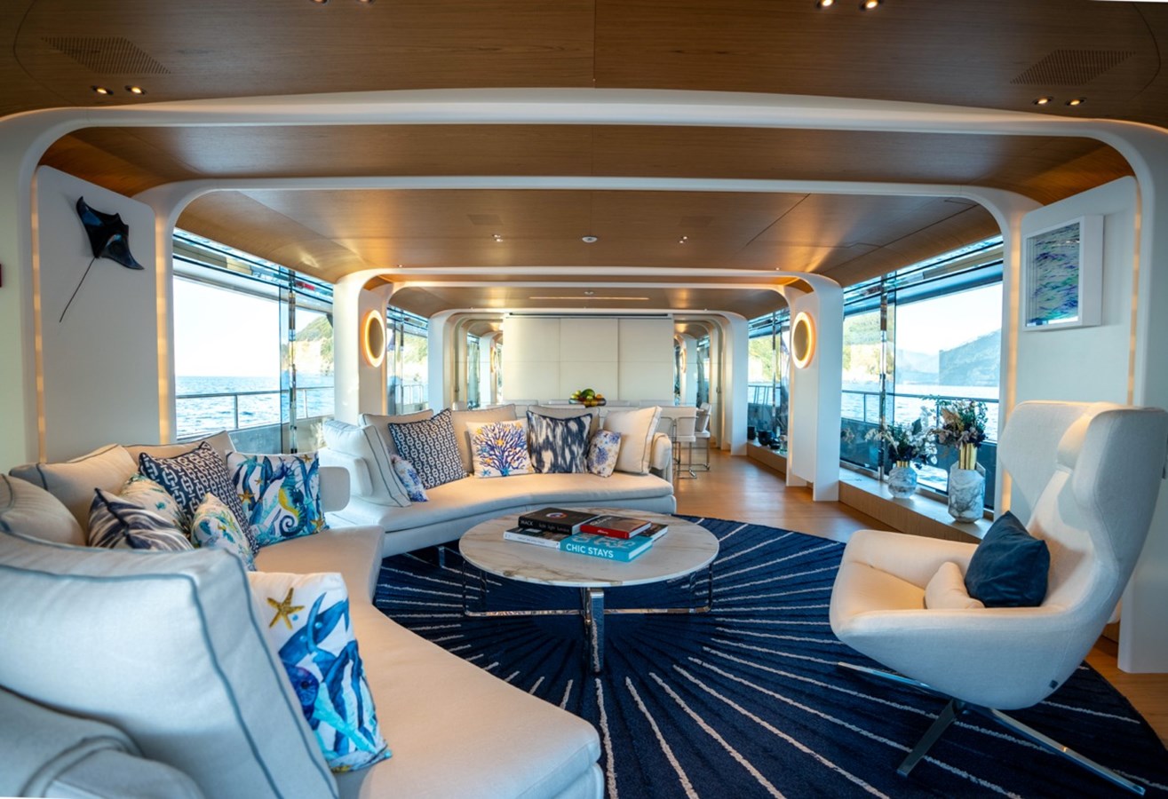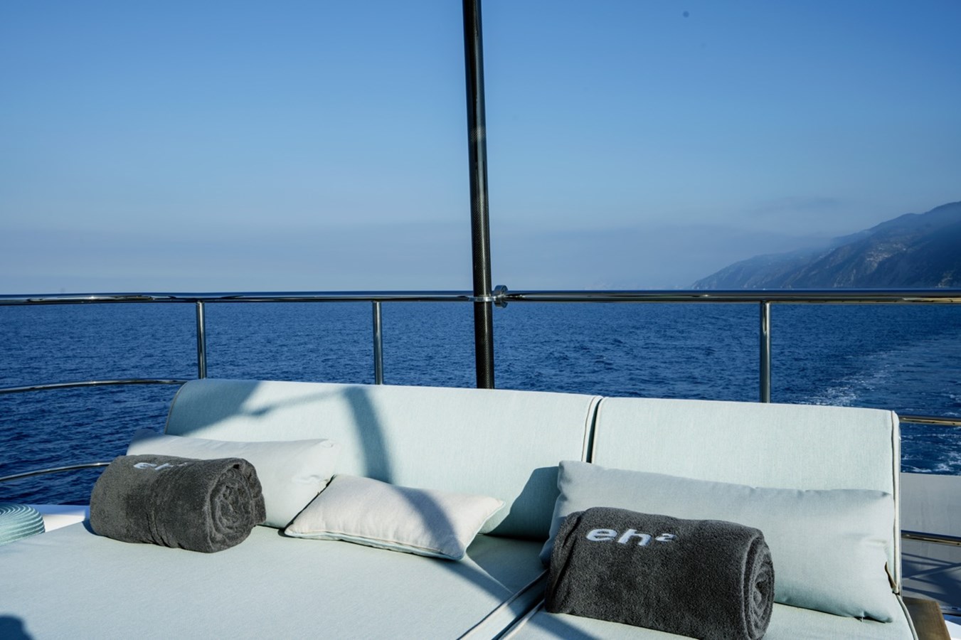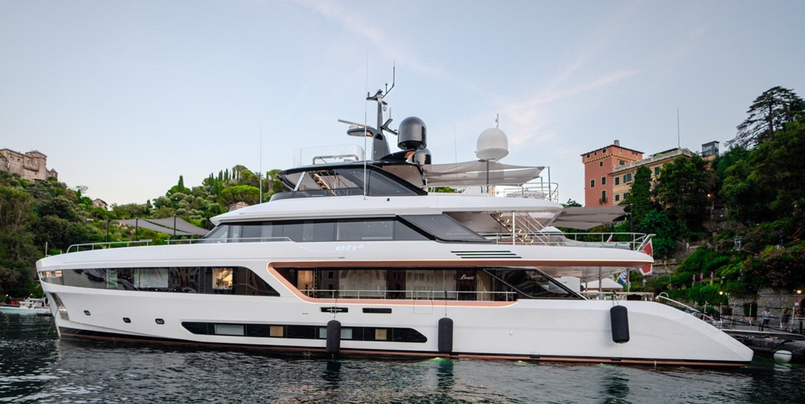 EH², a 2022 Benetti Motopanfilo 37M, merges 1960s nautical heritage with cutting-edge shipbuilding technology. The tri-deck layout features a smooth silhouette, creating a sophisticated and nostalgic look. This yacht series celebrates the classic Benetti motopanfilo-style yachts from the 1960s and 70s, which were the height of fashion with the celebrity set — musician David Bowie had one, as did Monaco’s Prince Rainier.