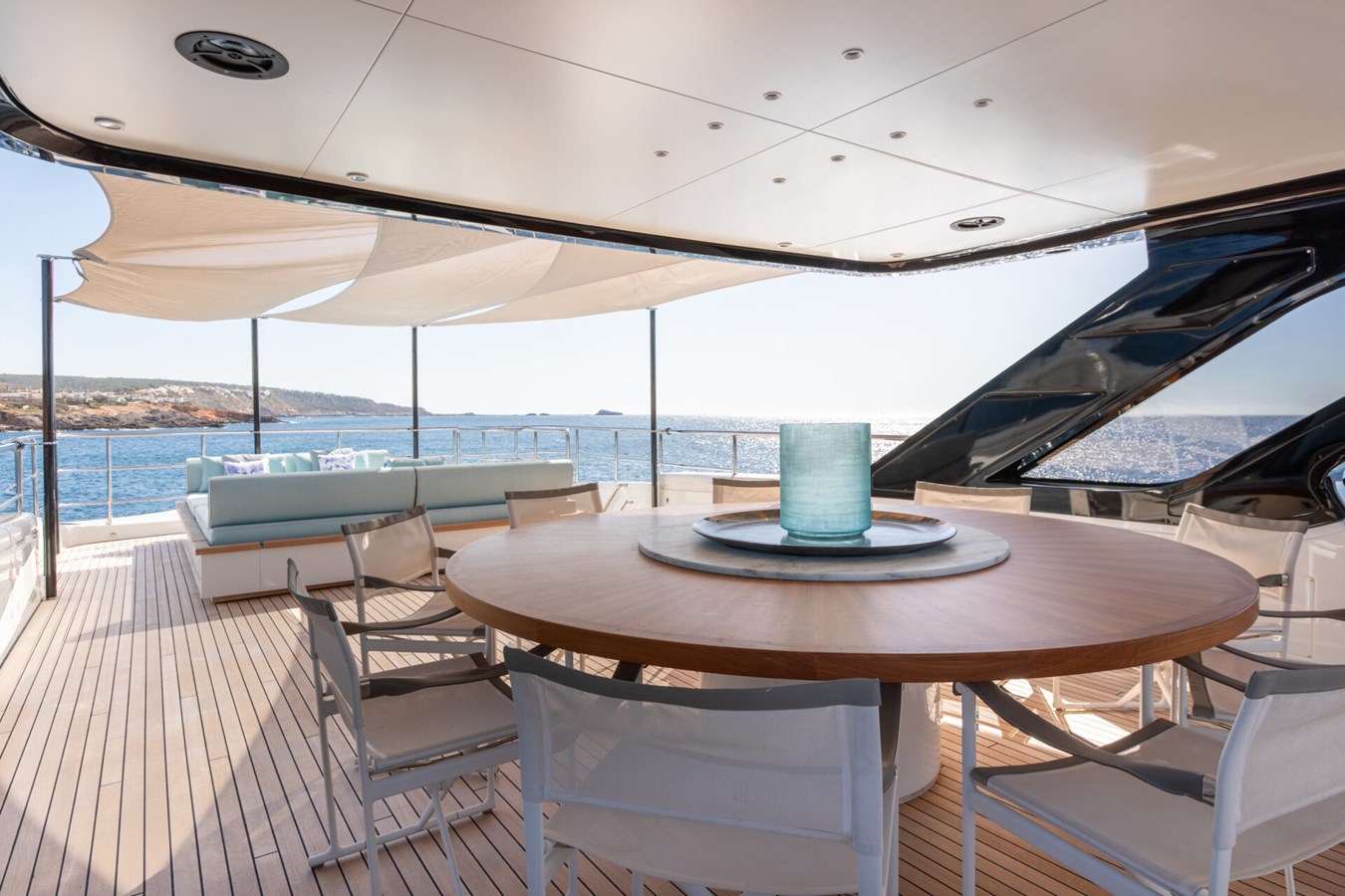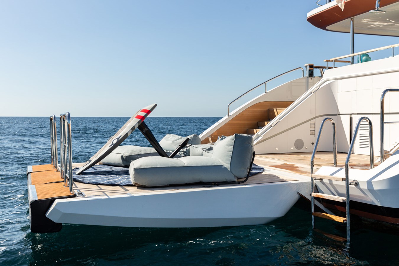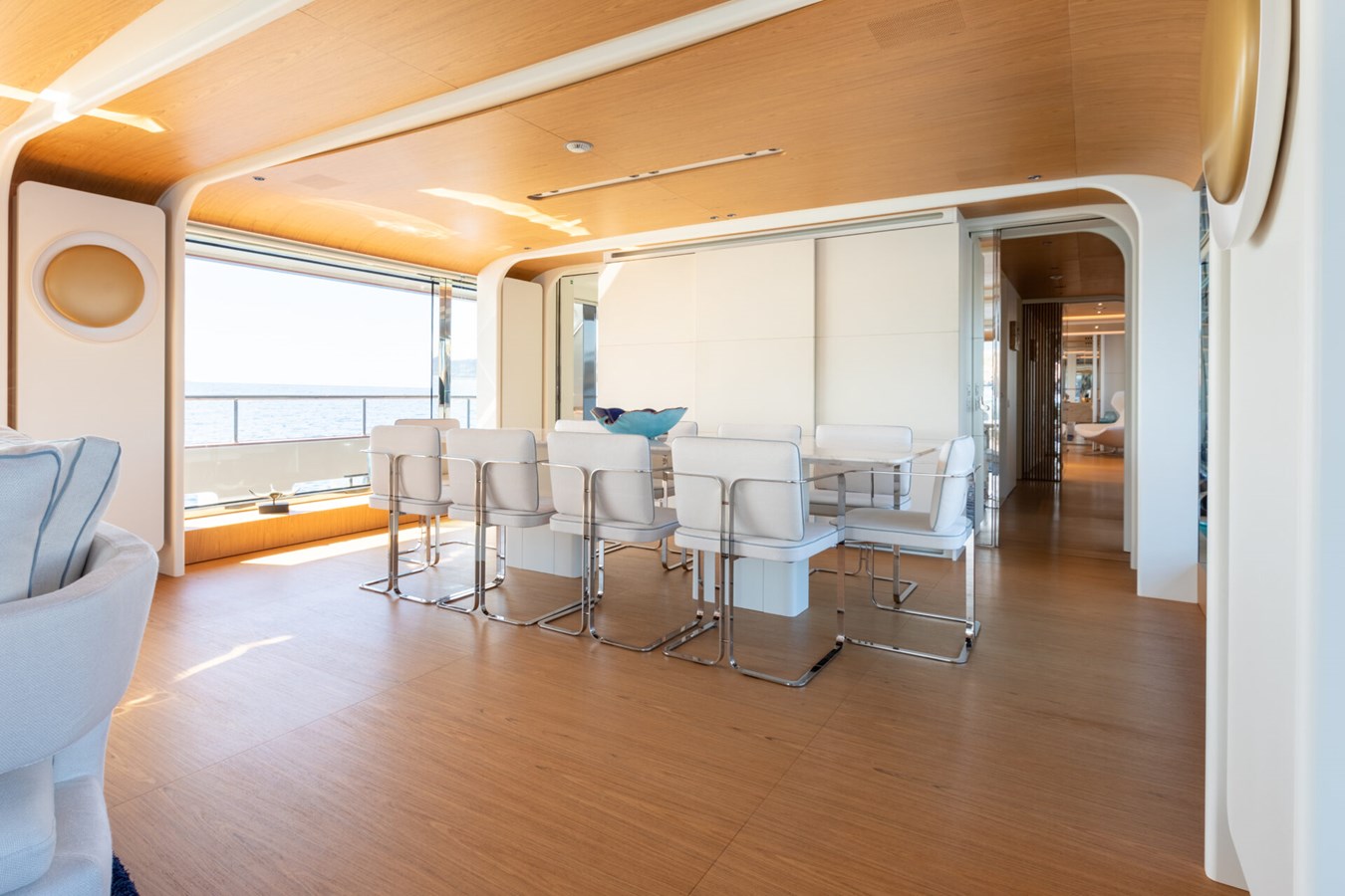 EH², a 2022 Benetti Motopanfilo 37M, merges 1960s nautical heritage with cutting-edge shipbuilding technology. The tri-deck layout features a smooth silhouette, creating a sophisticated and nostalgic look. This yacht series celebrates the classic Benetti motopanfilo-style yachts from the 1960s and 70s, which were the height of fashion with the celebrity set — musician David Bowie had one, as did Monaco’s Prince Rainier.