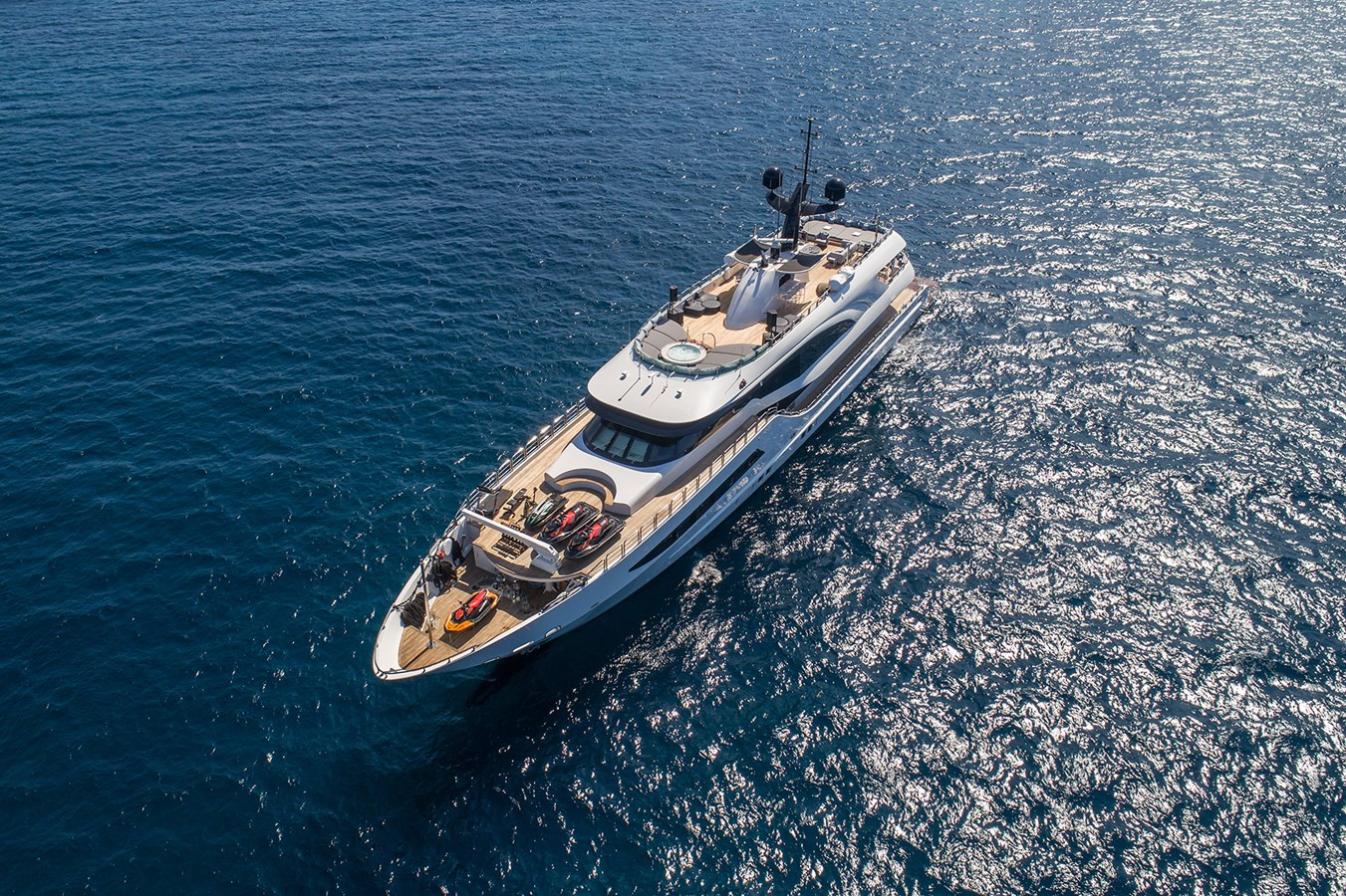 Upper Deck – Accessible via side walkways and upper stairways, it includes a comfortable C-shaped sofa and a forward area with an impressive collection of motorized water toys.