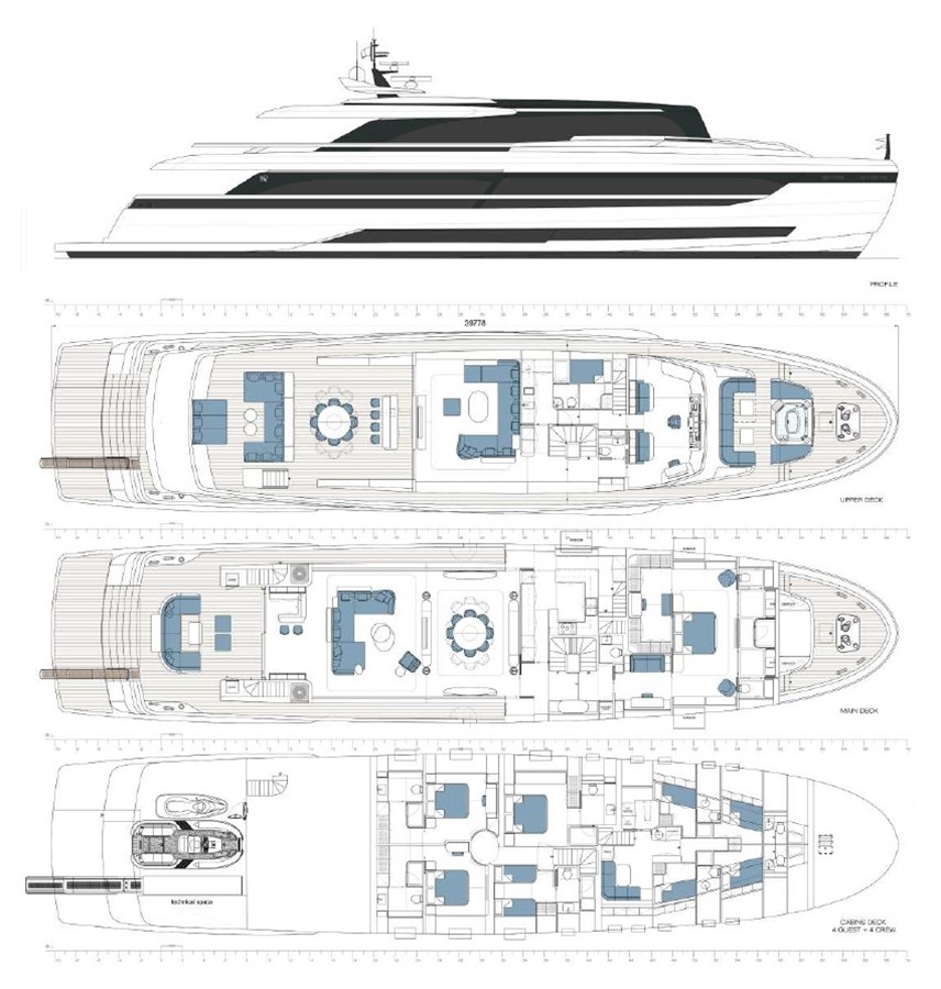Designed by Francesco Guida, her exterior and interior work in perfect harmony to create a fluid connection between sea and sky. Expansive decks invite outdoor living, from the aft lounge and al fresco dining area to the foredeck sunpads and jacuzzi.