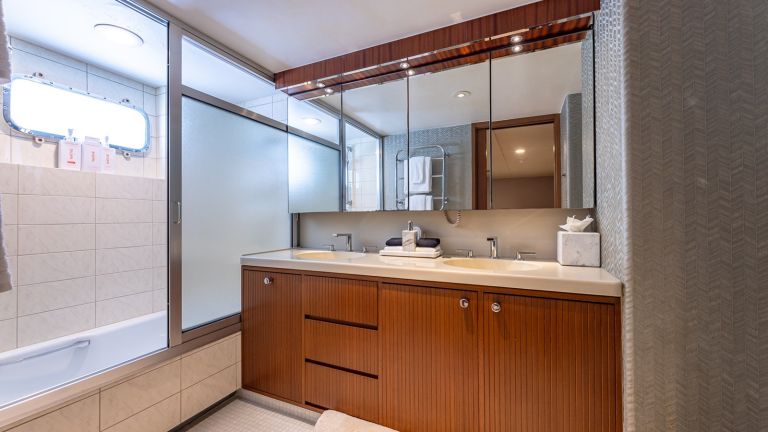 LADY SANDALS features a steel hull and aluminum superstructure with twin Caterpillar 3512 DITA engines. She can accommodate eight guests in four staterooms and carries up to 7 crew to ensure a relaxed and enjoyable experience onboard.