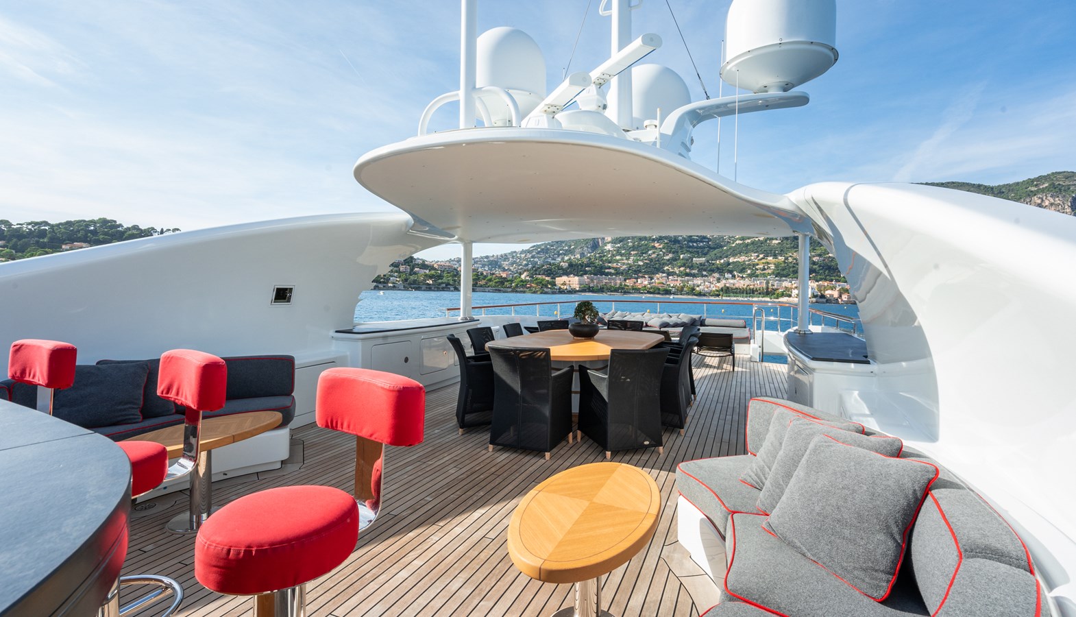 The master suite, located on the main deck, has its private terrace and a full-beam ensuite including a Jacuzzi and a walk-in wardrobe. The remaining guest cabins, each equipped with state-of-the-art entertainment systems and ensuite bathrooms, are located on the lower deck, offering panoramic sea views, ensuring an enjoyable and comfortable stay for every guest onboard.