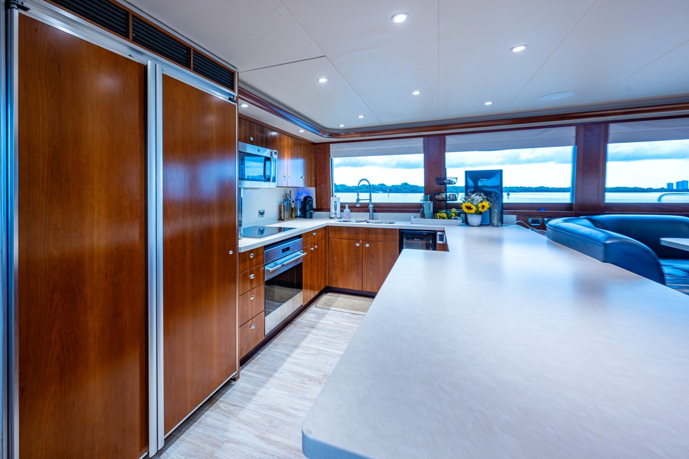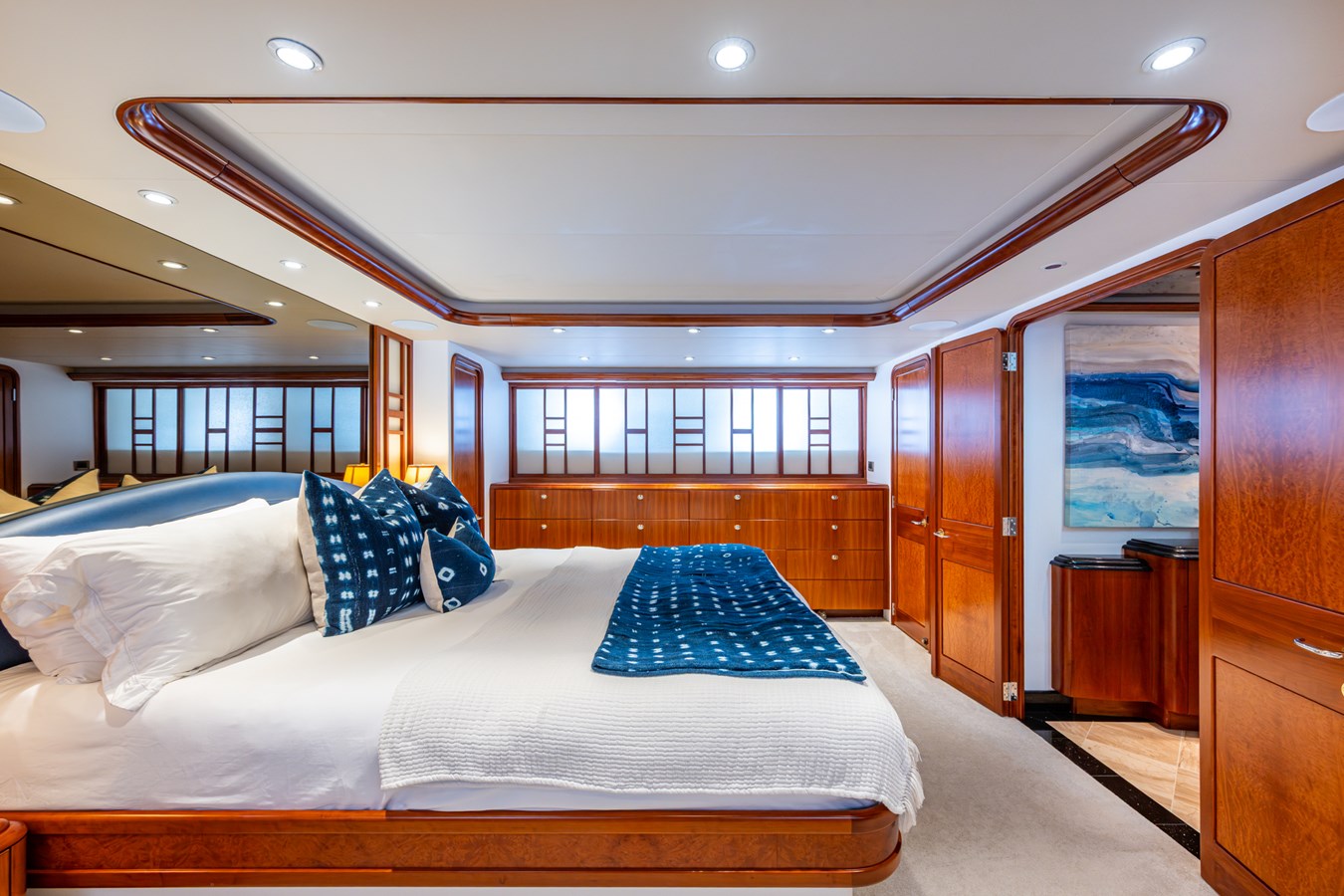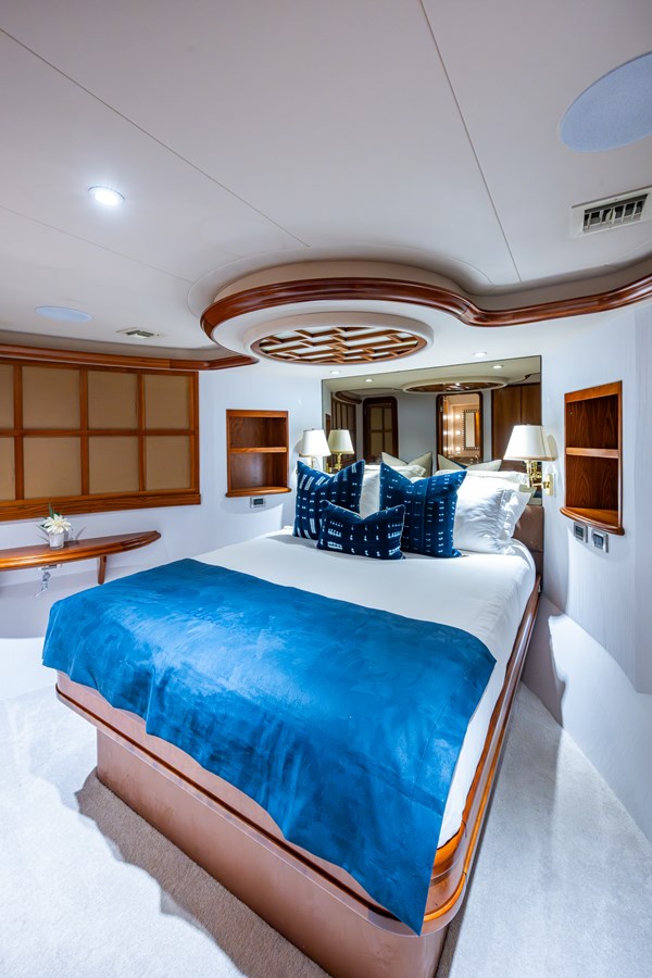 Her interior was transformed in 2019 by Chanel Coontz of Neosage, replacing dated tones with a serene indigo palette, elegant Azul stone surfaces, and sea-inspired details—creating a calm, sophisticated atmosphere. Further updates in 2021 added new teak on the swim platform, refreshed galley flooring, and updated crew spaces.