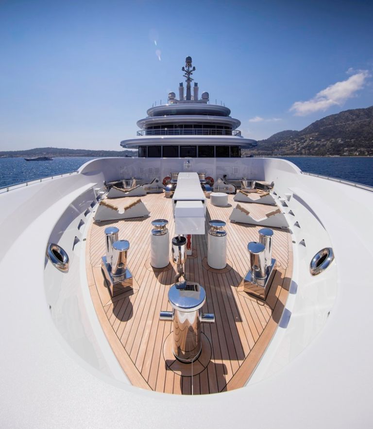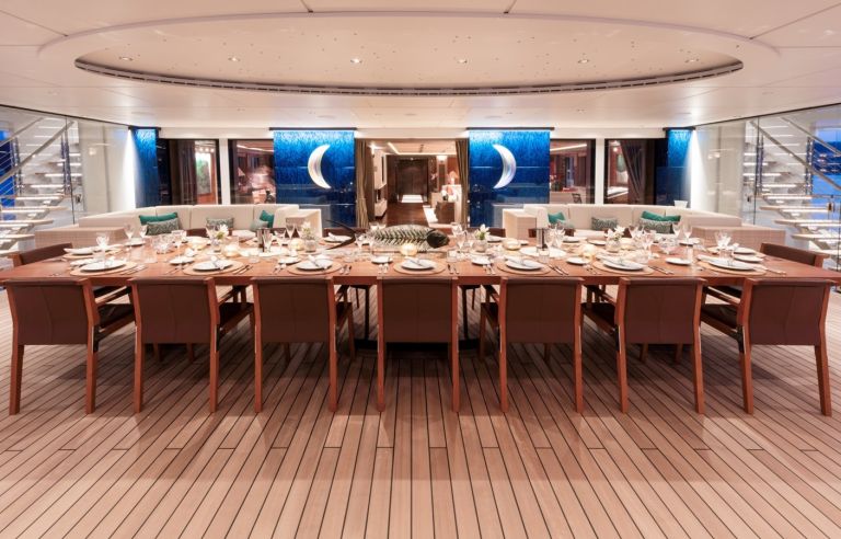 Built with a steel hull and aluminium superstructure, LUNA cruises at 16.8 knots, reaches a top speed of 22 knots, and offers a range of 9,500 nautical miles. Four retractable stabilizers ensure impeccable comfort both underway and at anchor.