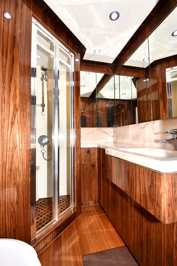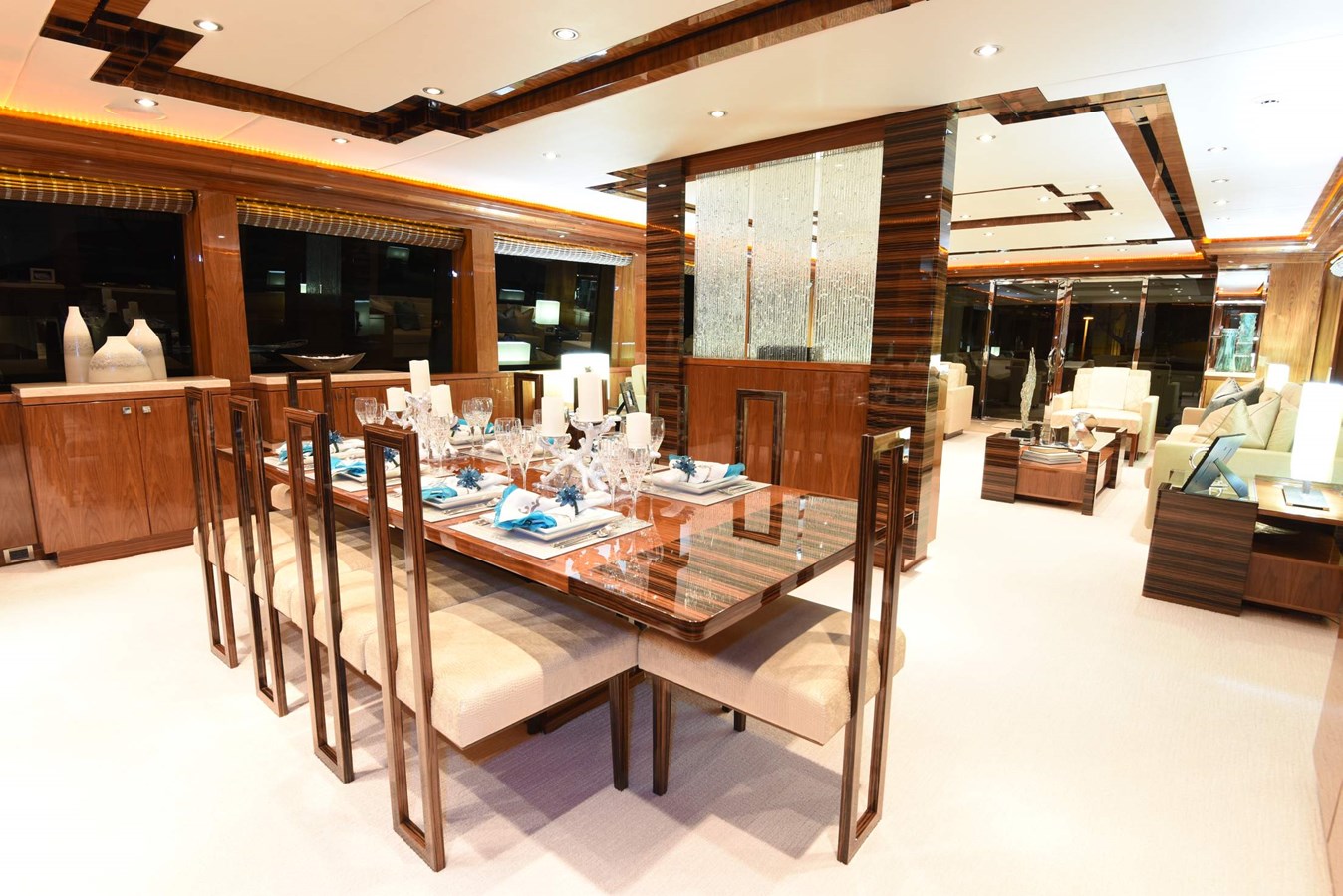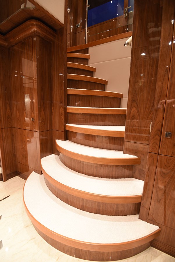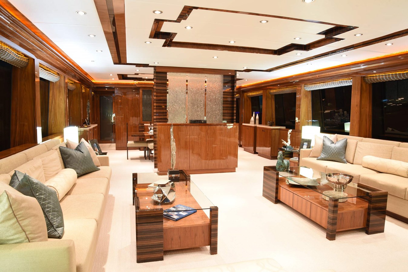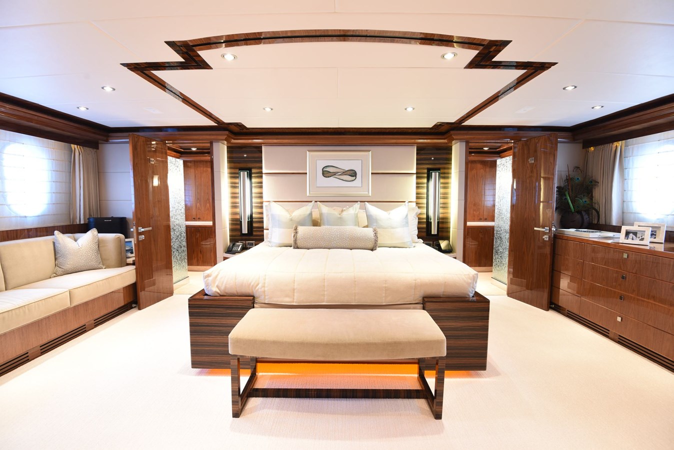 European styling and full wrap-around windows create breathtaking views from every angle. Sophisticated details like Cream Kaduna marble, gloss walnut cabinetry, and custom finishes elevate the onboard experience.