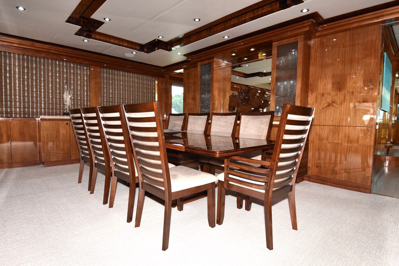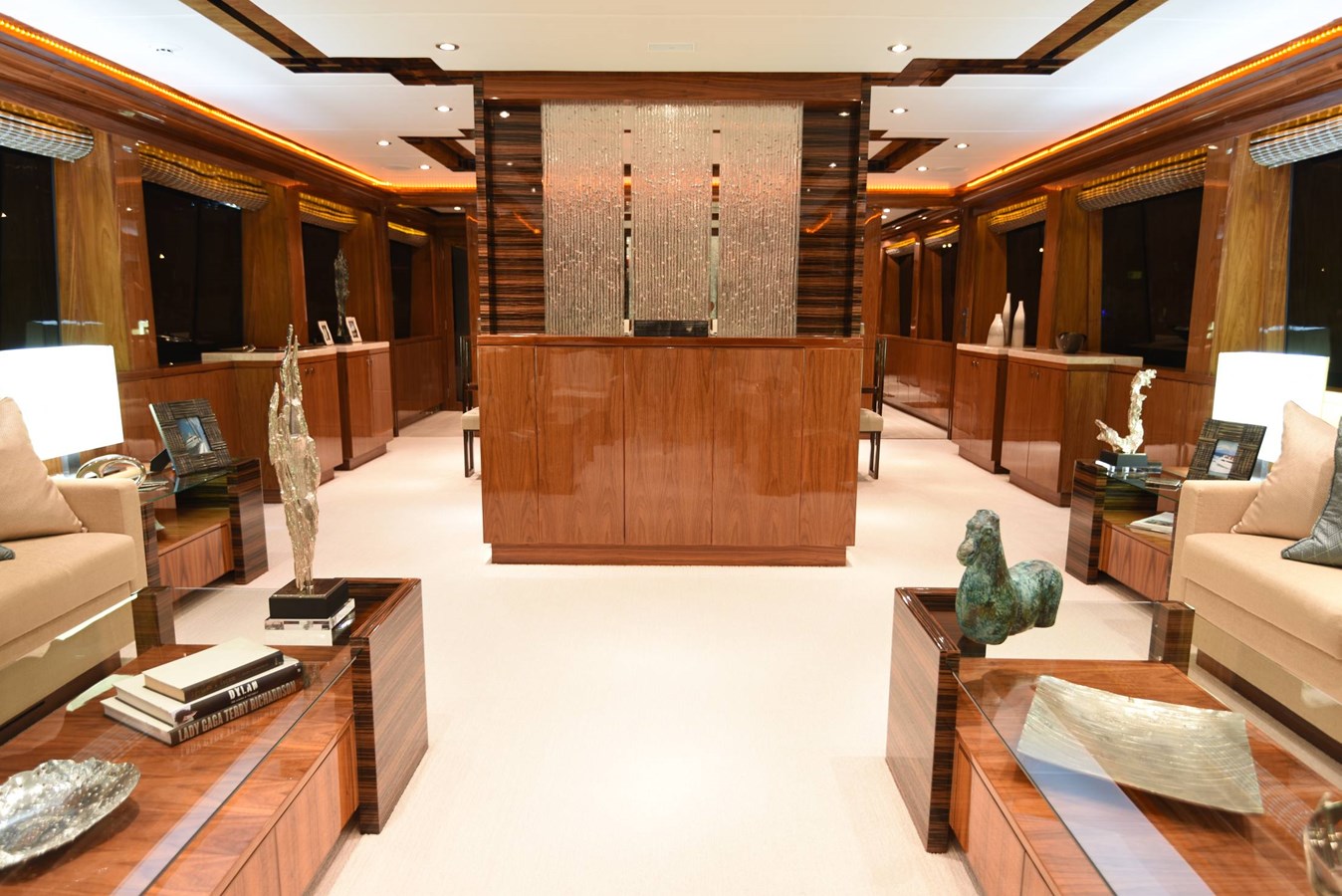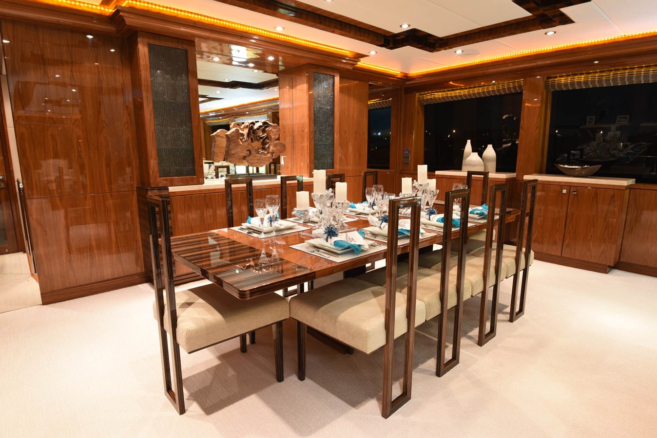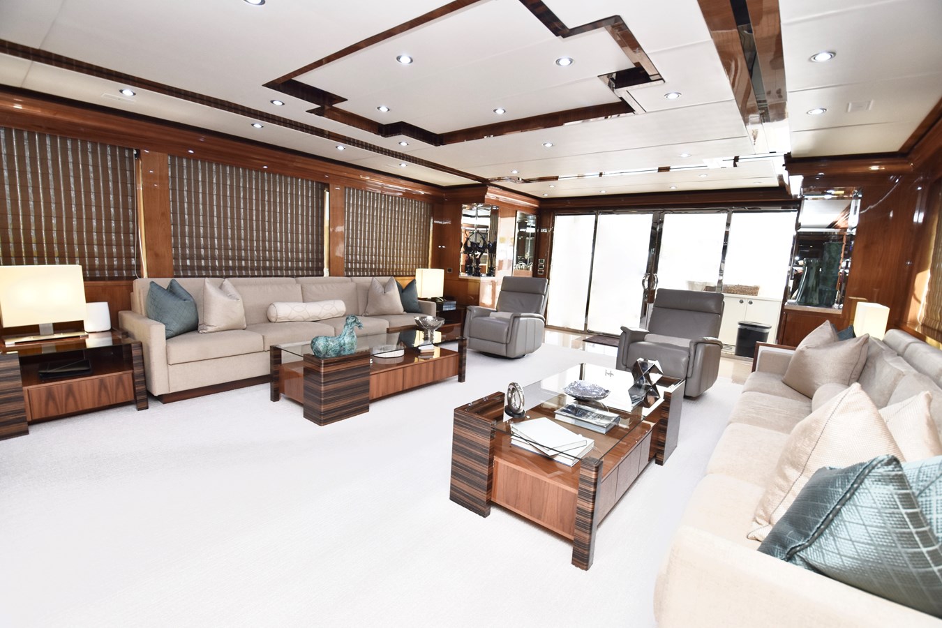 European styling and full wrap-around windows create breathtaking views from every angle. Sophisticated details like Cream Kaduna marble, gloss walnut cabinetry, and custom finishes elevate the onboard experience.