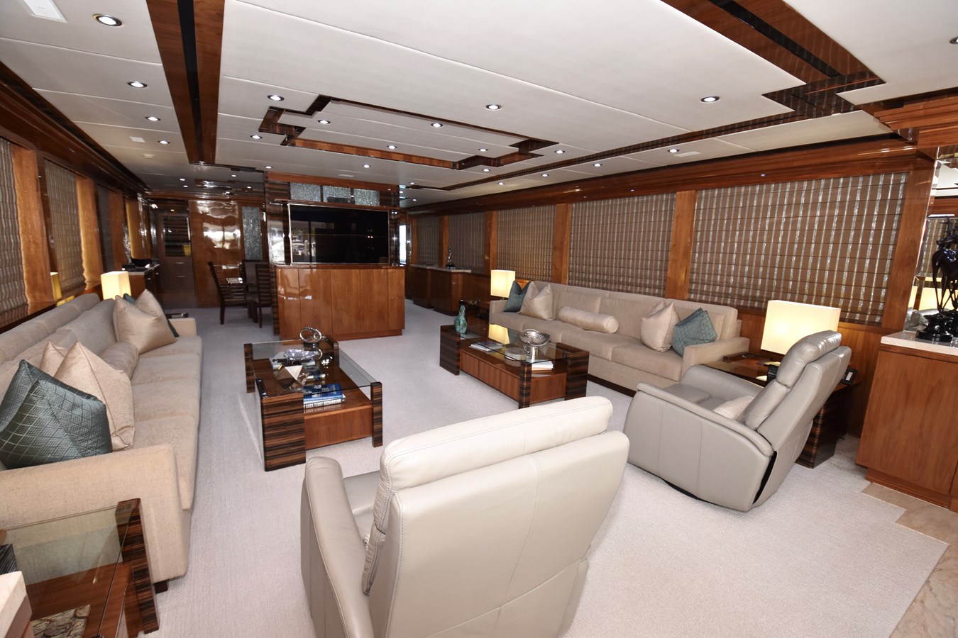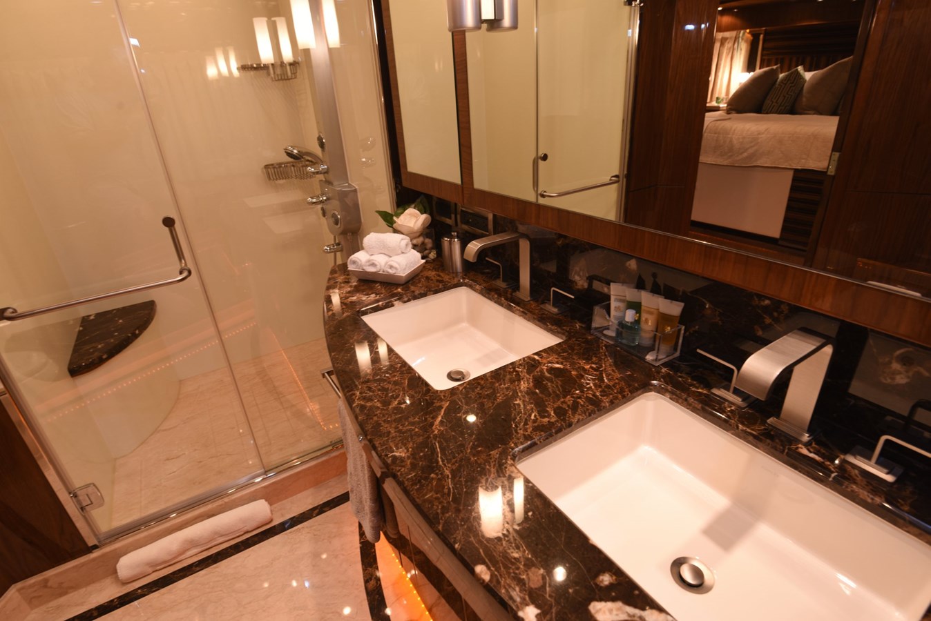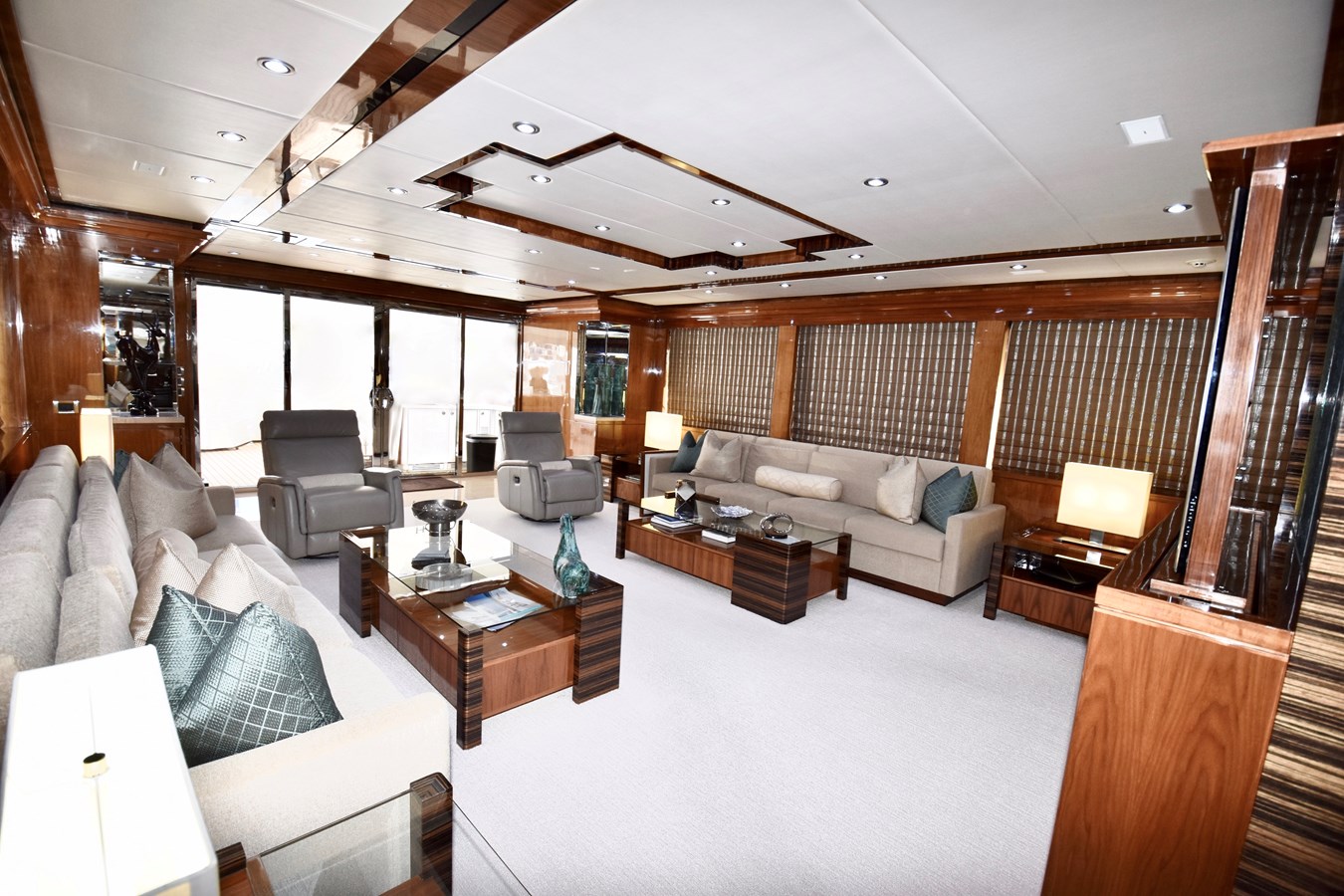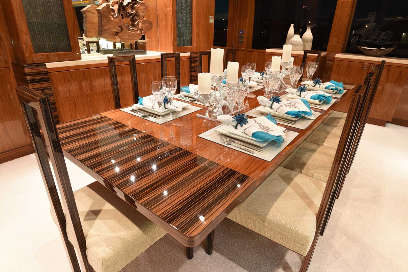 European styling and full wrap-around windows create breathtaking views from every angle. Sophisticated details like Cream Kaduna marble, gloss walnut cabinetry, and custom finishes elevate the onboard experience.