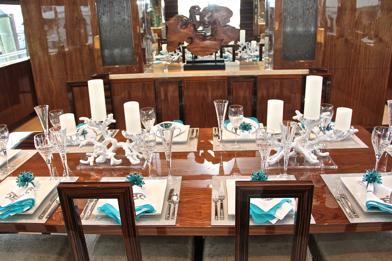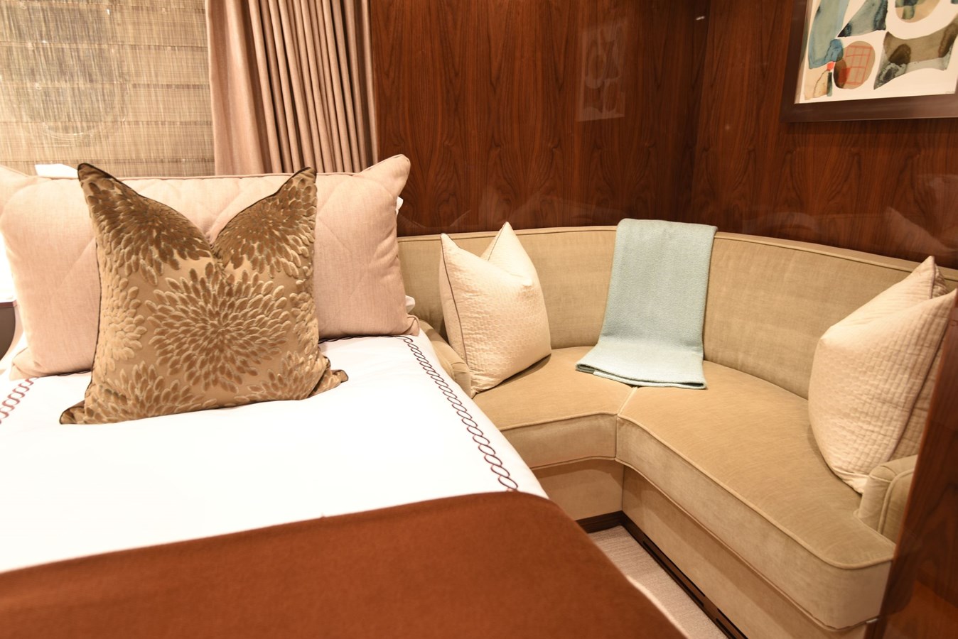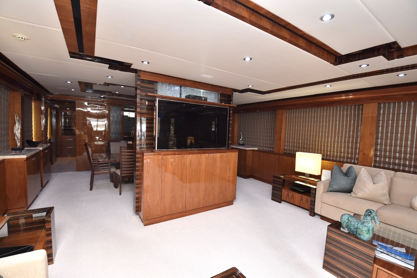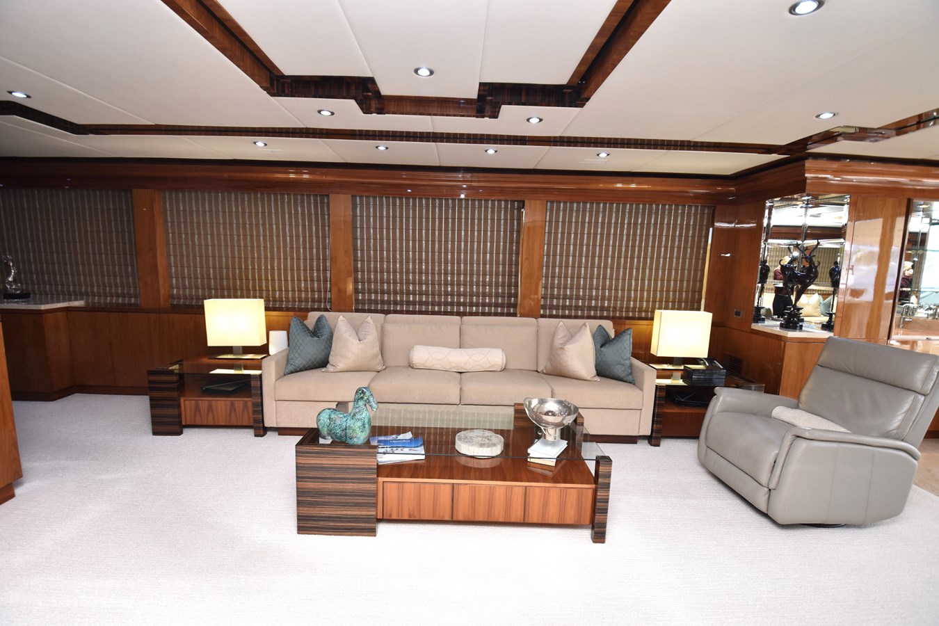 European styling and full wrap-around windows create breathtaking views from every angle. Sophisticated details like Cream Kaduna marble, gloss walnut cabinetry, and custom finishes elevate the onboard experience.