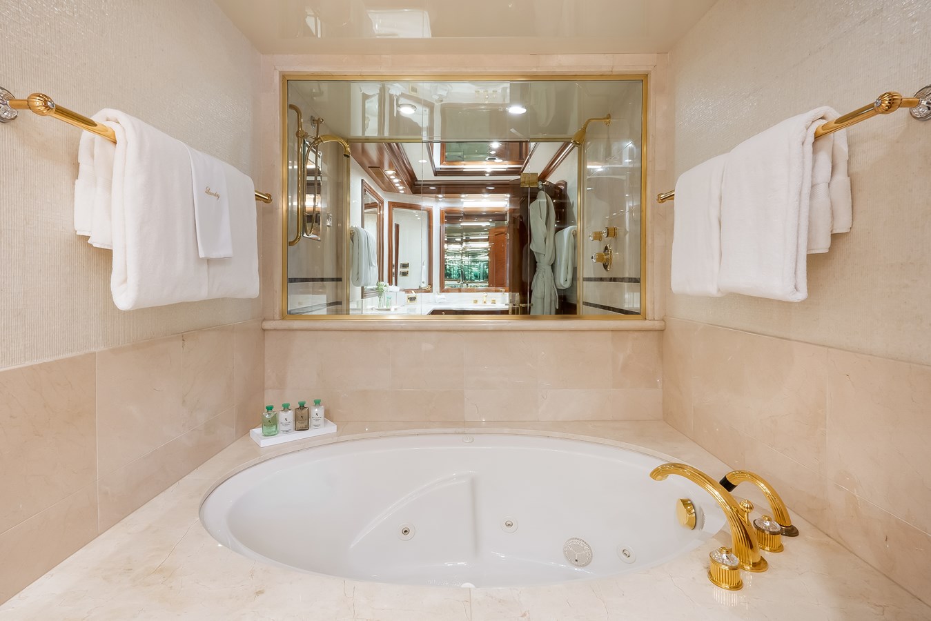 She features an ultra-modern stabilization system to ensure comfort at sea or at anchor. The main deck full-beam master has a king’s berth and his and hers ensuite. The VIP room is located on the bridge deck and has a queen berth as well as a large ensuite. Below deck are 2 large guest staterooms with queen berths and ensuites, and 2 twin cabins with twin berths. All staterooms have ample closets and storage, as well as entertainment systems.