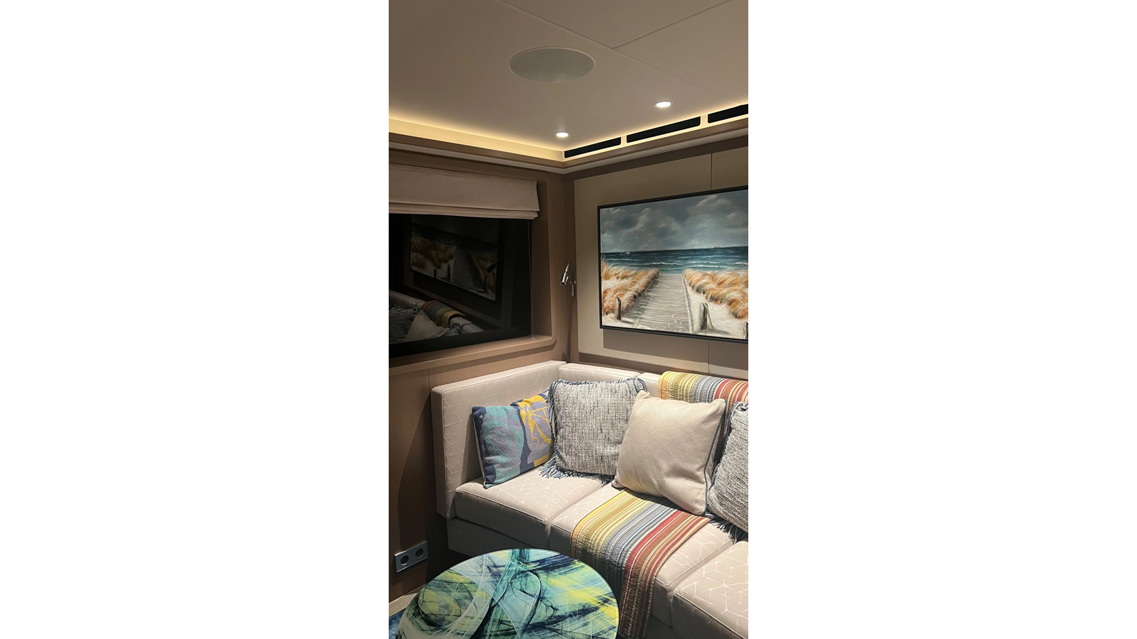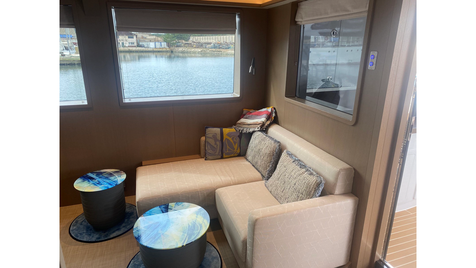 Inside the bridge deck is an intimate lounge with guest seating and direct access to the helm station. The main deck has a welcoming full-beam lounge area complete with an L-shaped sofa, TV and pantry, which serves as a relaxed gathering space for post-exploration lounging.