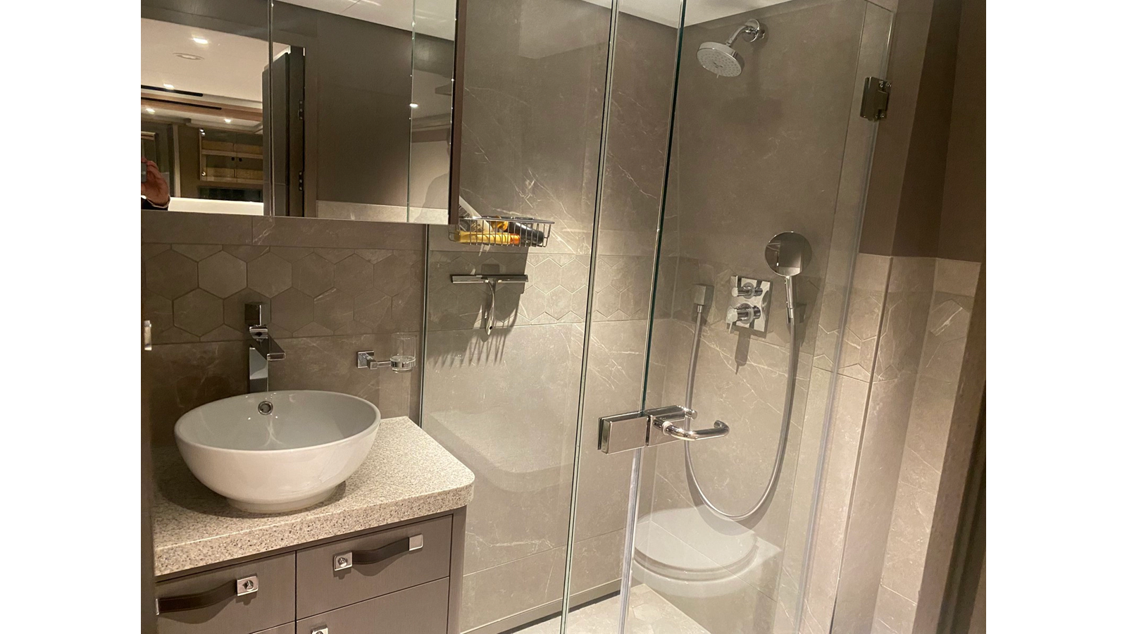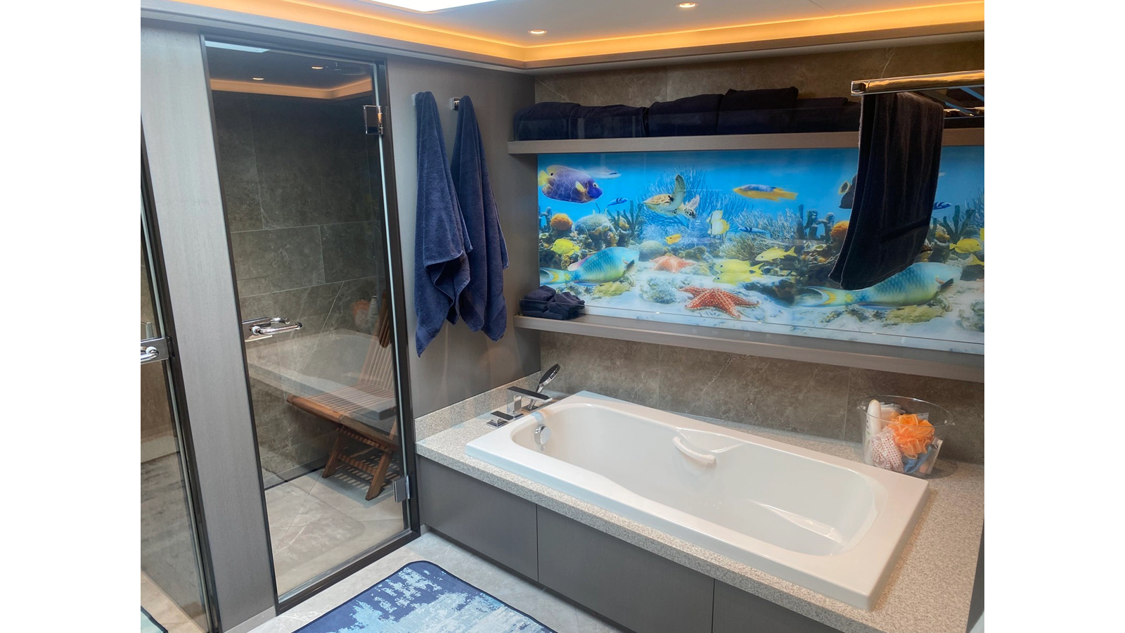 NO DESTINATION welcomes up to seven guests in three cabins. There is a full-beam owner’s suite forward on the main deck with a desk to port, walk-in wardrobe and en suite with skylight, steam shower room and bathtub. Aft of the owner’s suite there are two guest cabins, one double cabin and one bunk cabin with three berths, both with en suite facilities.