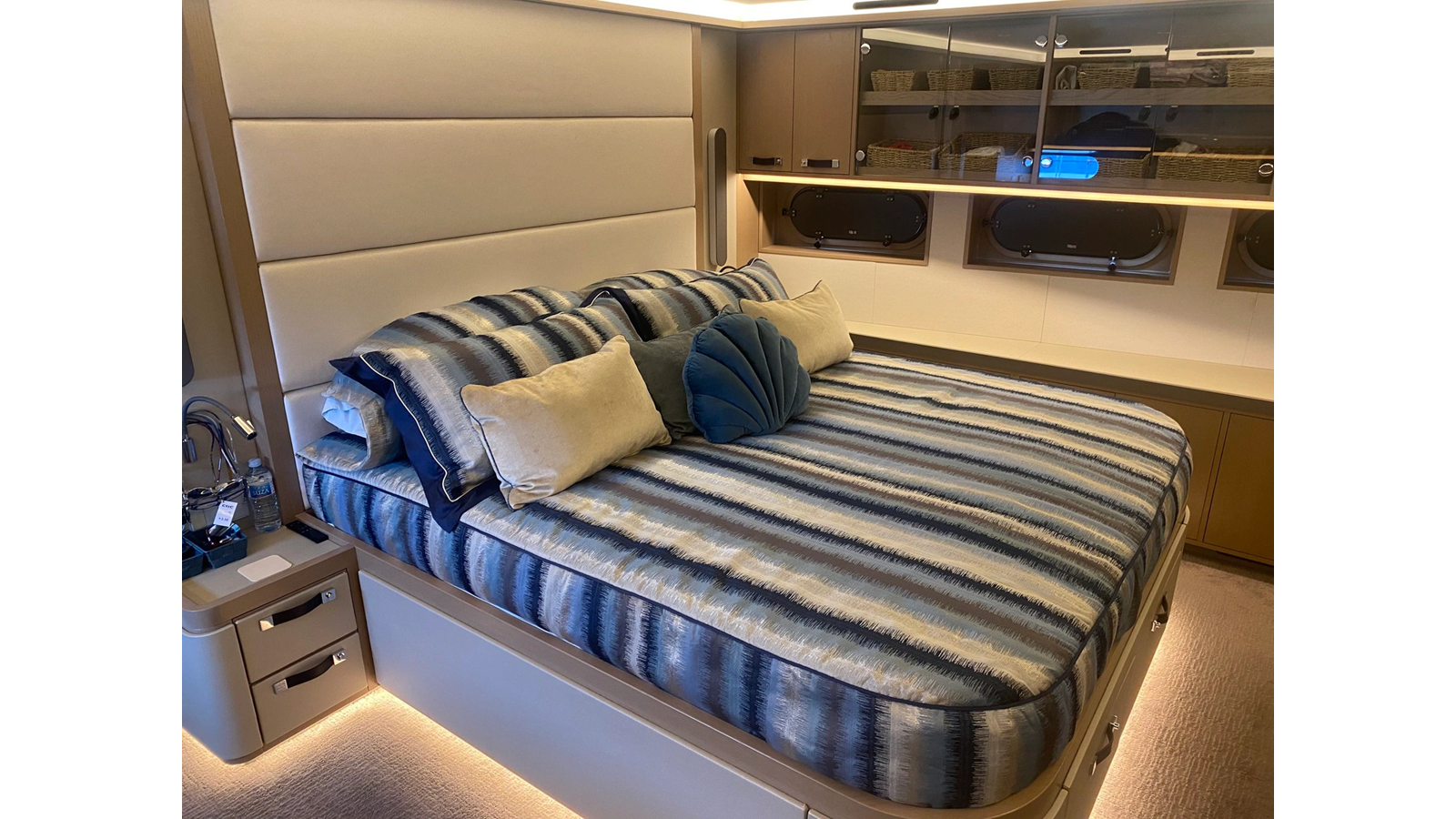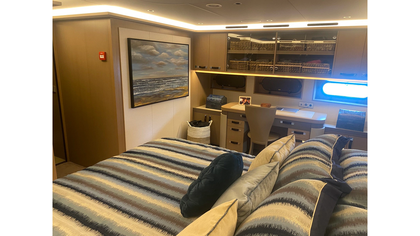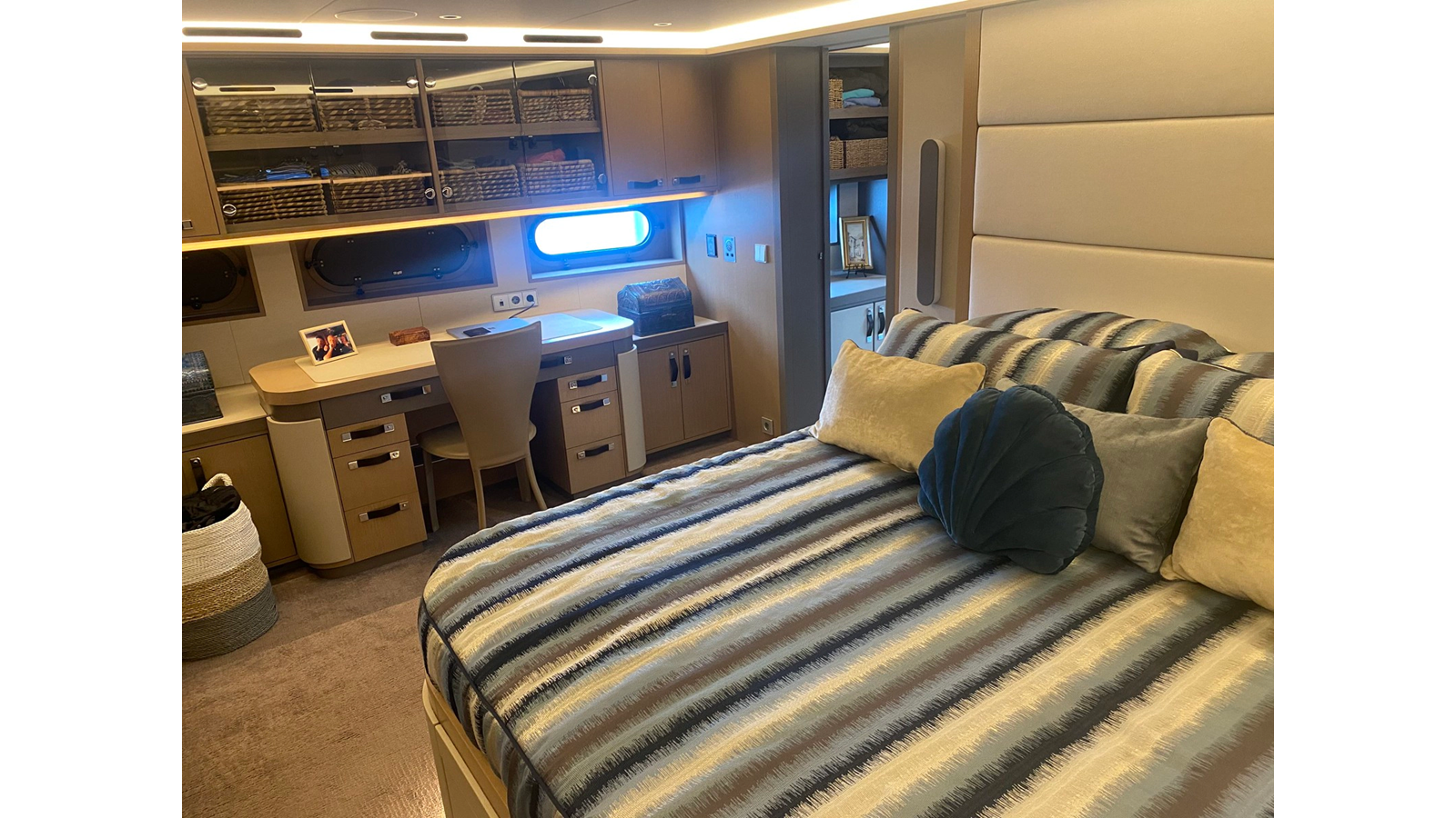 Twin 1,400hp Caterpillar C32 diesel engines give her a top speed of 22 knots and a range of 3,500nm at her passage speed of 10 knots. Humphree fins and interceptors ensure guest comfort underway and at anchor and the sale includes a custom 28ft Munson Packcat landing craft tender, 5.5m Zodiac RIB, Hobie cat, electric bicycles, scuba diving equipment, two SeaDoos and more.