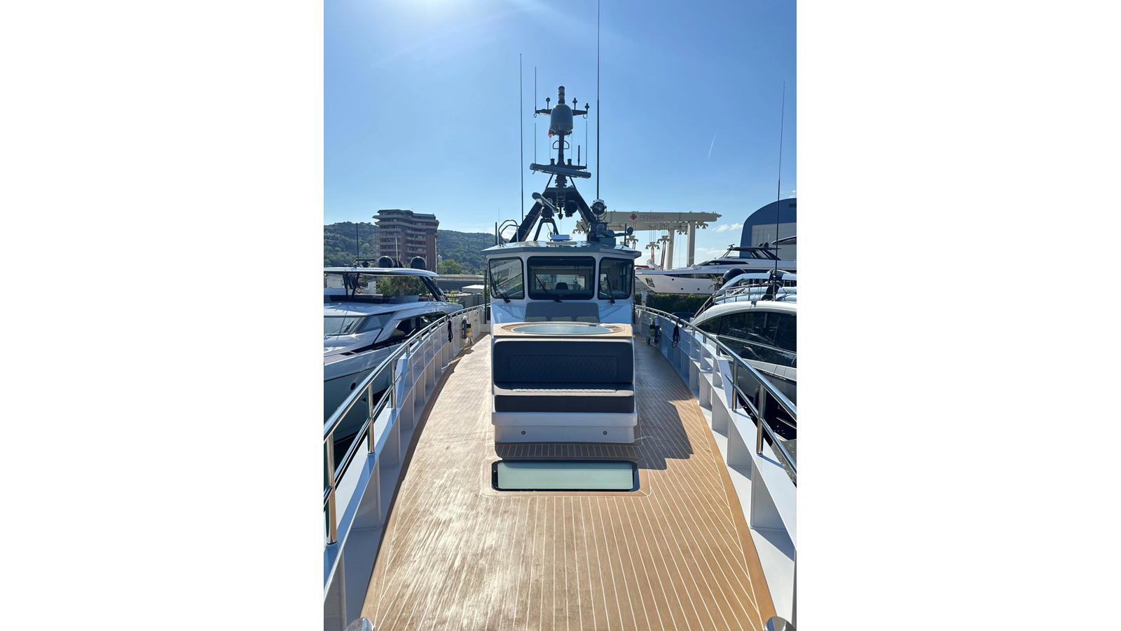NO DESTINATION delivers incredible views from her foredeck sun lounge with jacuzzi and on the bridge deck aft there is a lounge that doubles as an open-air dining area. On the main deck aft there is a second al fresco dining option with BBQ shaded by the overhang, overlooking the tender and toy storage. When the tenders are in the water, this versatile space can be used in a variety of ways depending on the owner’s desires.