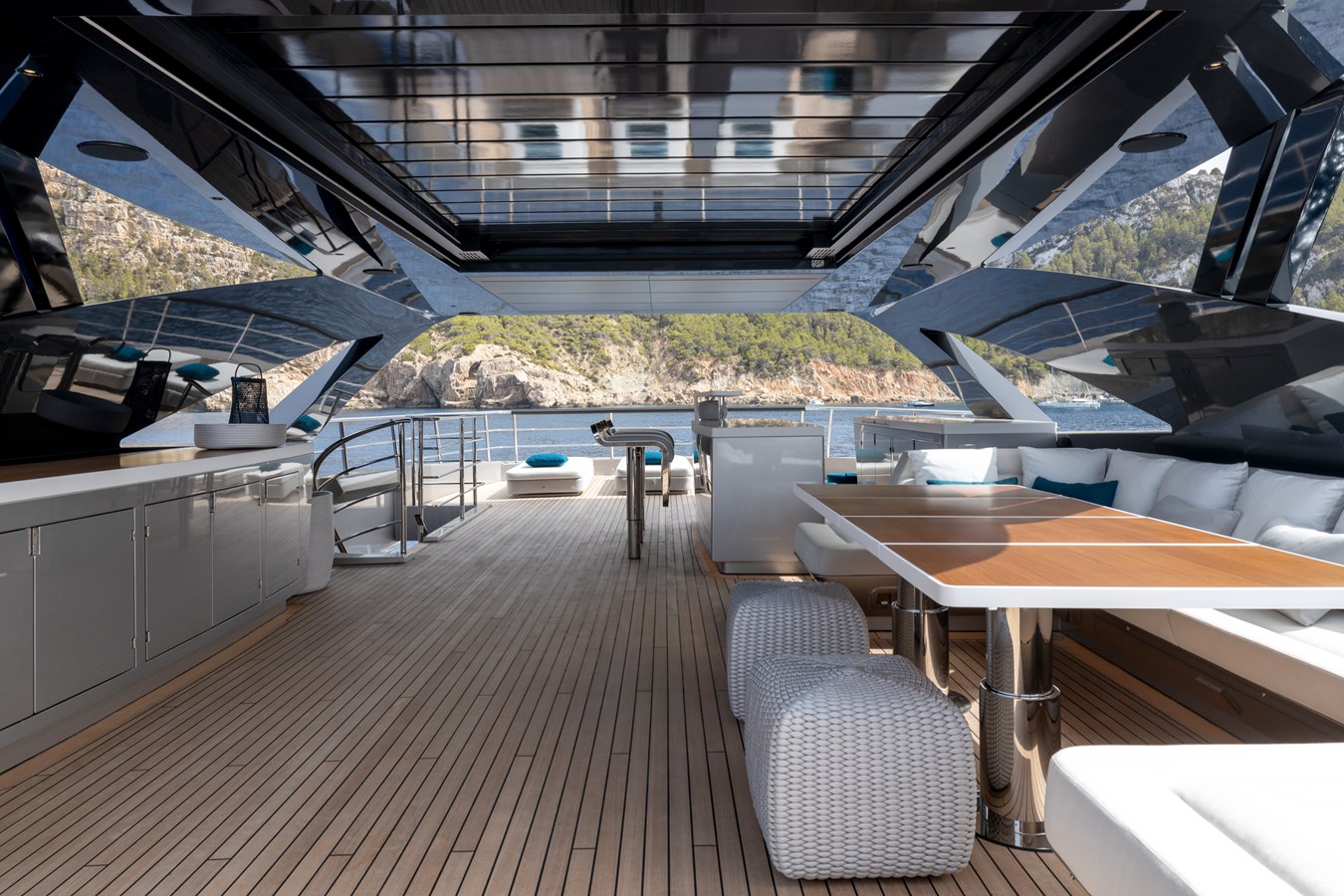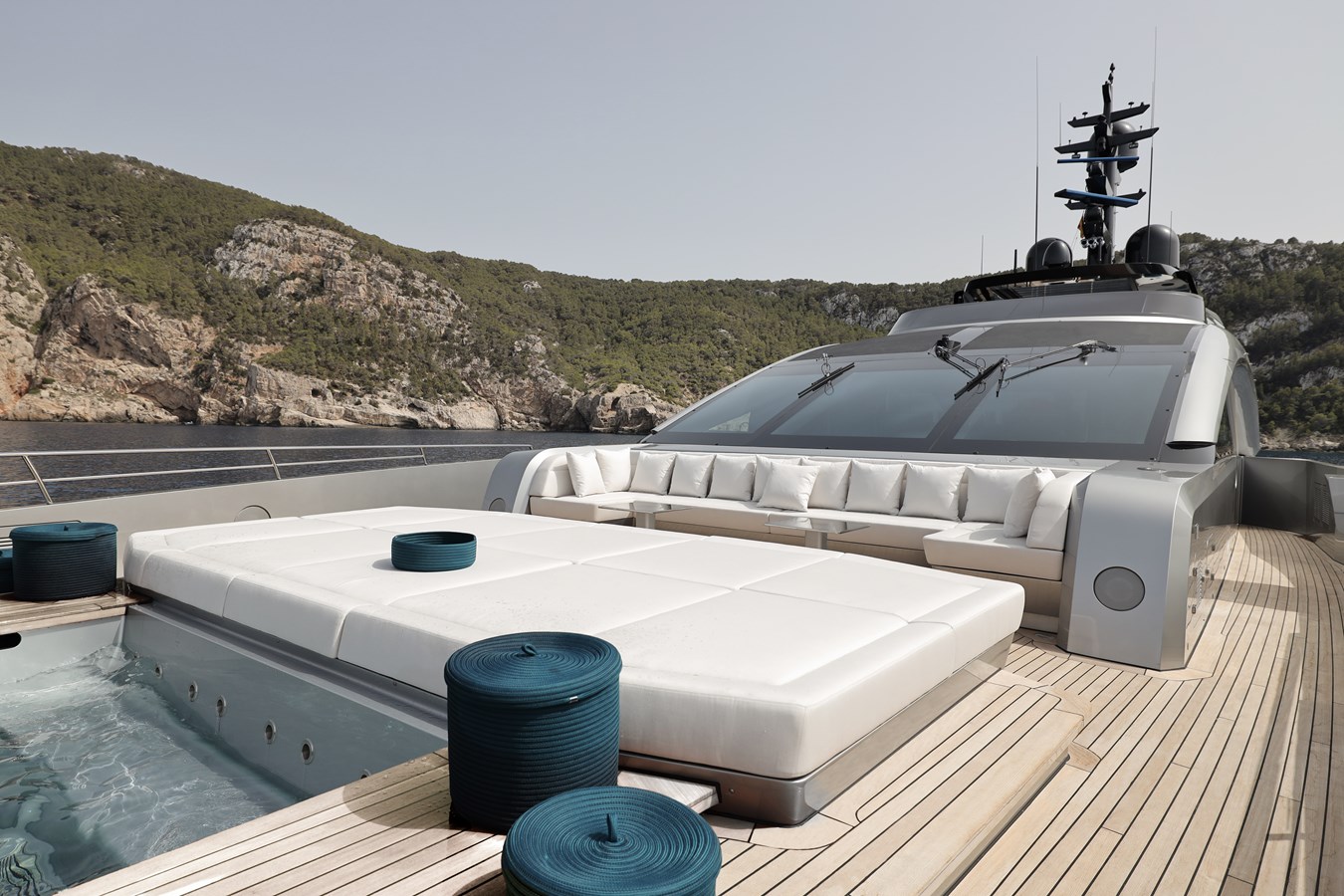On-deck highlights include a spacious, walk-around bow with a 10-square-metre pool and the aft cockpit overlooking a large open beach club.