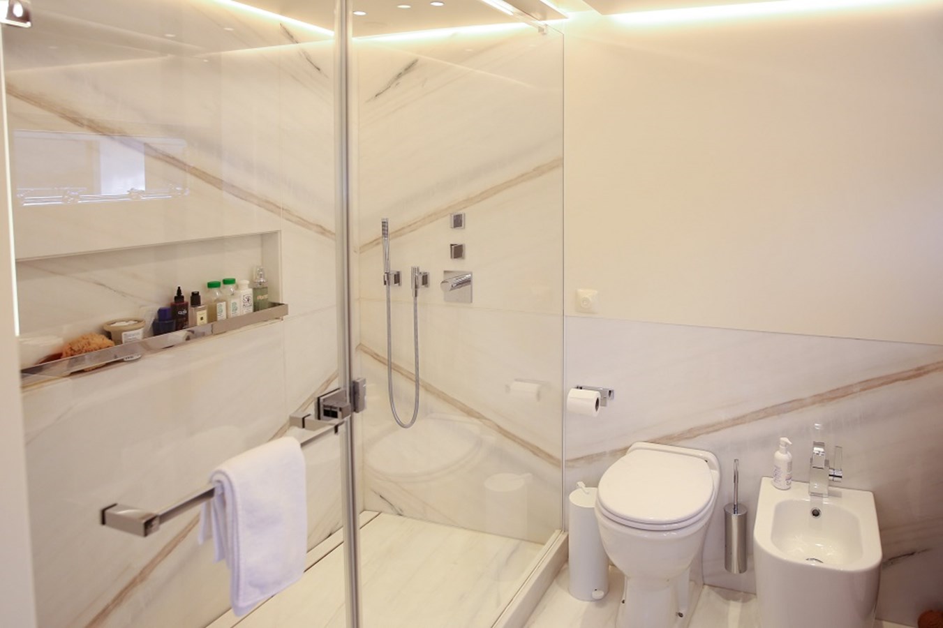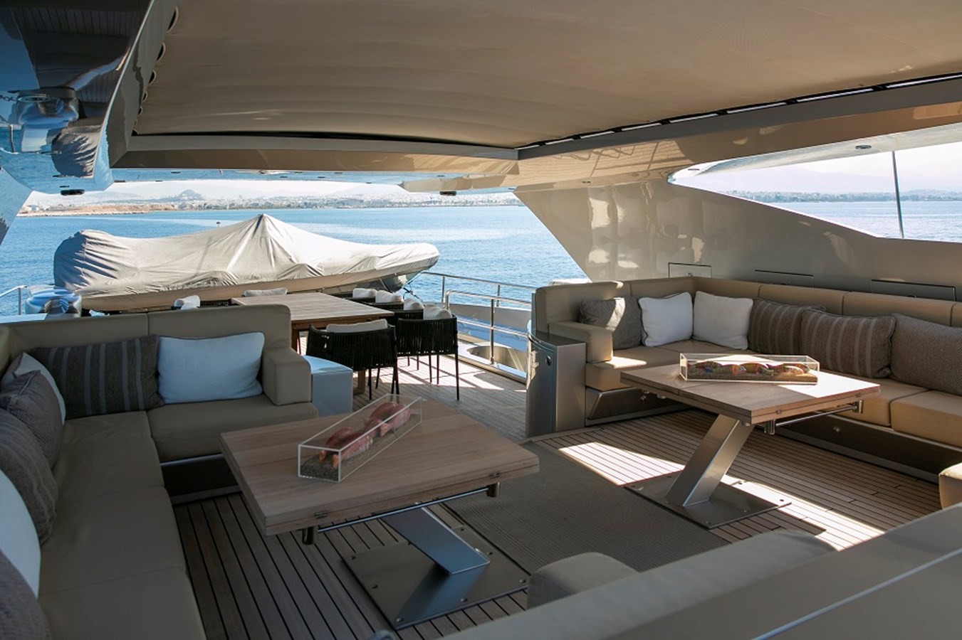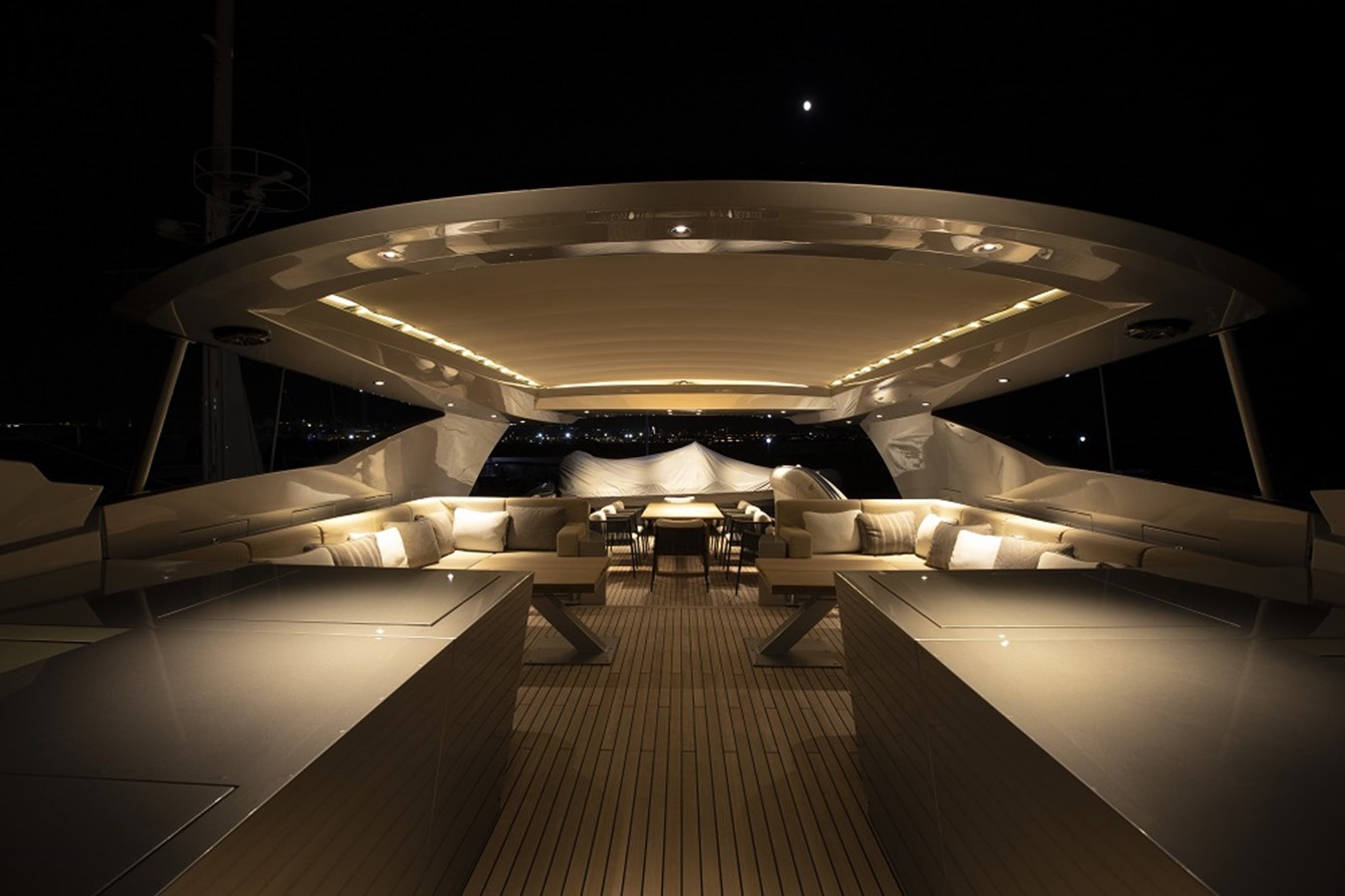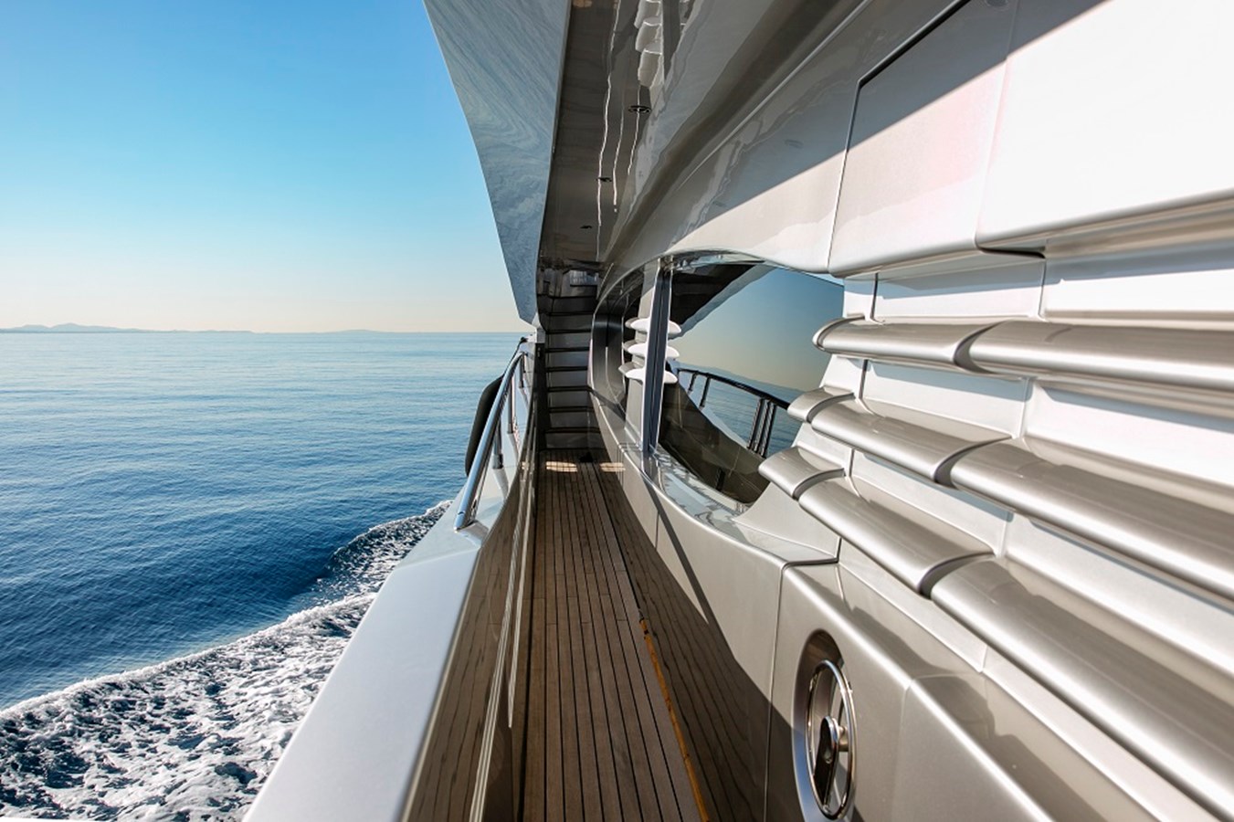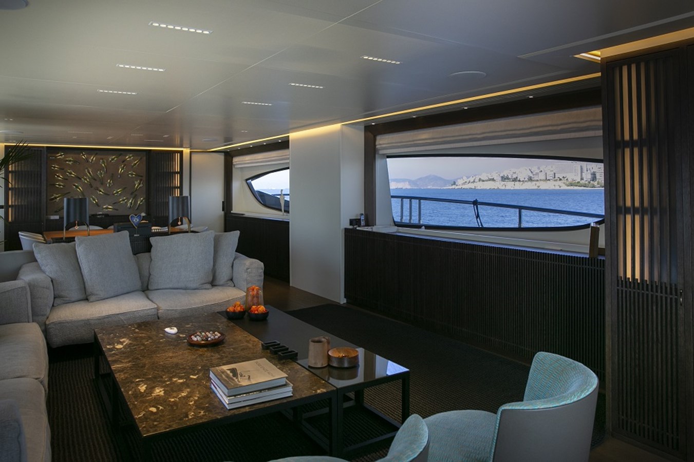 With a beam of 7.4m and a draft of 2.8 m this adds up to a gross tonnage of 248 tons. She is powered by MTU engines of 3.750 hp each giving her a maximum speed of 28 knots and a cruising speed of 24 knots. Peftasteri’s maximum range is estimated at 900 nautical miles. The motor yacht can accommodate 10 guests in 5 cabins. The yacht was designed by Carlo Galeazzi.