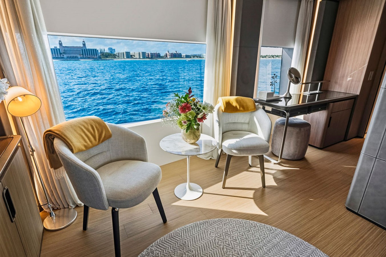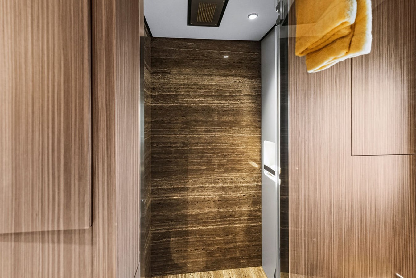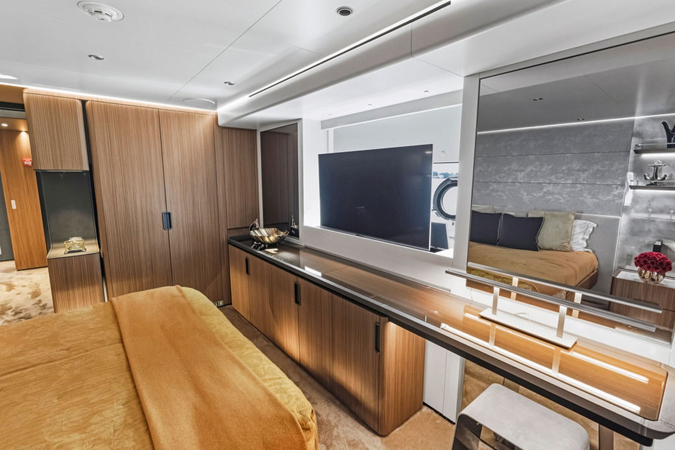 The main salon is spacious and inviting, with panoramic windows that create a seamless connection to the sea. The thoughtfully arranged lounge and dining areas make the space suitable for both relaxed cruising and elegant entertaining. High-quality materials, fine wood finishes, and intricate detailing reflect Custom Line’s commitment to craftsmanship and timeless design.