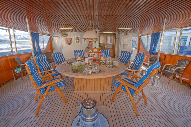 Outside, ample space awaits for entertainment and relaxation. The upper bridge deck features a covered gym area and an open seating area, while further aft offers storage for the main tender and a hydraulic crane. On the main deck aft, a private and enclosed seating area with a large circular teak table provides a perfect setting for intimate gatherings, accommodating up to 10 guests.