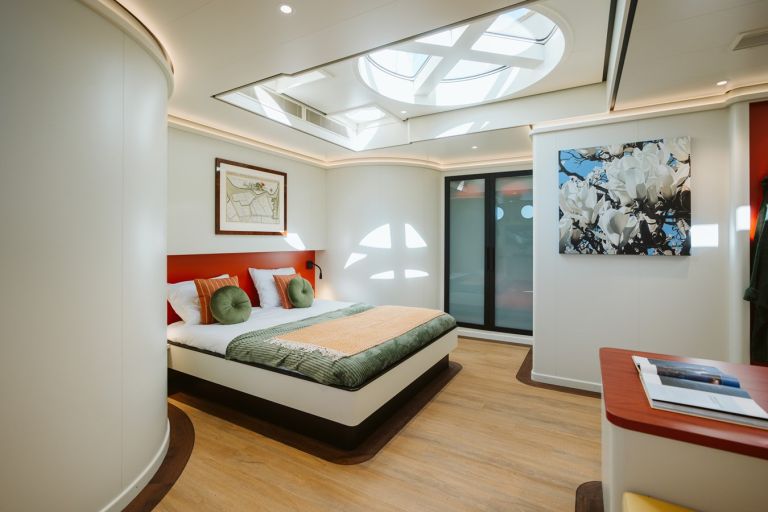 The main deck has a welcoming full beam main galley, designed as a ‘country kitchen’ to foster culinary interactions with the chef. On the spacious bridge deck, three large monitors display navigational and operational information to provide guests with live situational awareness and serve as an open invitation to engage the officers in an informational dialogue.