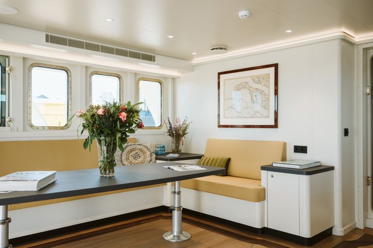 Outdoor comfort is exceptional on board, with recycled generator heat for outdoor ambient heating on the Portuguese Bridge and aft deck. There’s also six-person observation platform elevated 15 meters above the water line where guests can keep an eye out for whales and other marine life or just relax and absorb the environment from aloft.