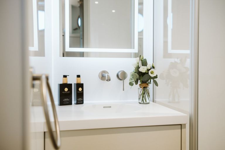 SCINTILLA MARIS boasts an open, bright, contemporary and comfortable interior, designed to accentuate daylight and connect guests with the yacht’s environment. Her large master suite is located mid-ship on the lower deck and boasts a 1.5m diameter skylight and a lofty 2.4m ceiling height. The configuration of the five guest cabins offers flexibility in adapting to the guest’s requirements.