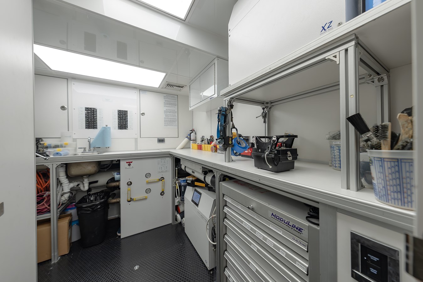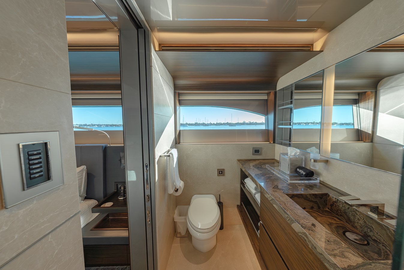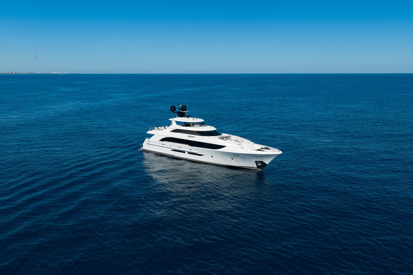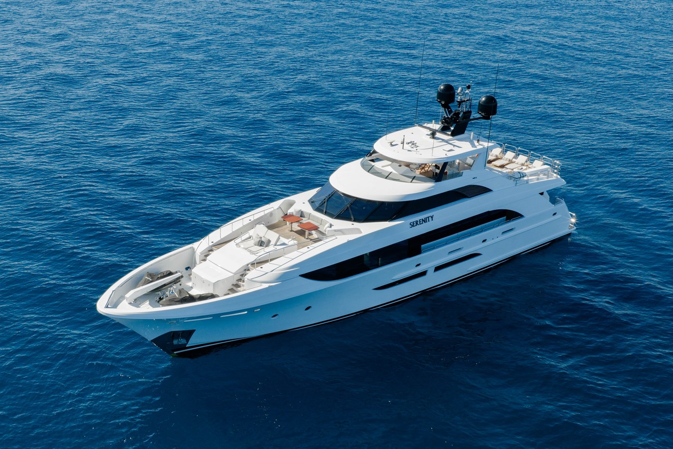 SERENITY features a contemporary interior designed by Holly Hunt. The design approach emphasizes a clear vision where casual elegance seamlessly combines with luxurious comfort, creating a cohesive theme throughout the space and materials. With windows extending to the ceilings, the design maintains a continuous flow from bow to stern, centering around the dining area as the heart of the yacht. This uninterrupted flow is key to the overall success of the project.