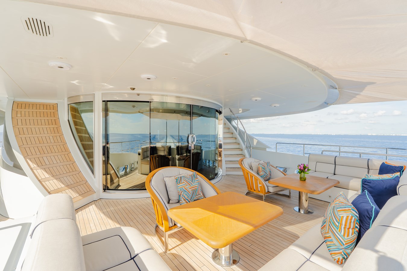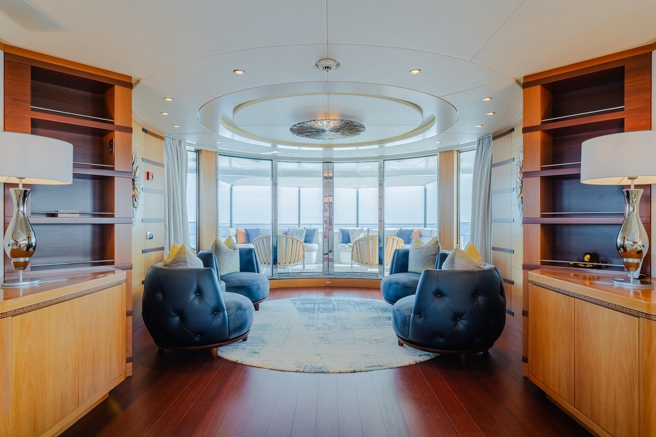 ➡️ Expansive Entertainment Spaces – Sundeck with Jacuzzi, bar, large lounging area, and discreet service via dumbwaiter; circular aft lounge with panoramic views for seamless indoor-outdoor living.