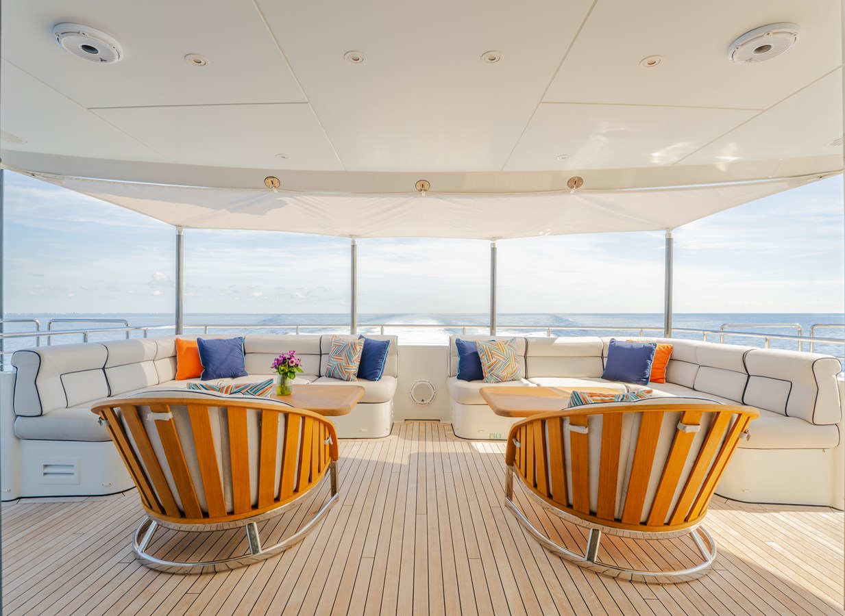 The main salon and dining area flow seamlessly into a circular aft lounge with panoramic views and direct access to the aft deck—perfect for indoor-outdoor living. The expansive sundeck includes a Jacuzzi, a large lounging area, and an entertainment bar equipped with a remarkable sound system and full galley amenities, including a dumbwaiter to the galley deck for discreet service.