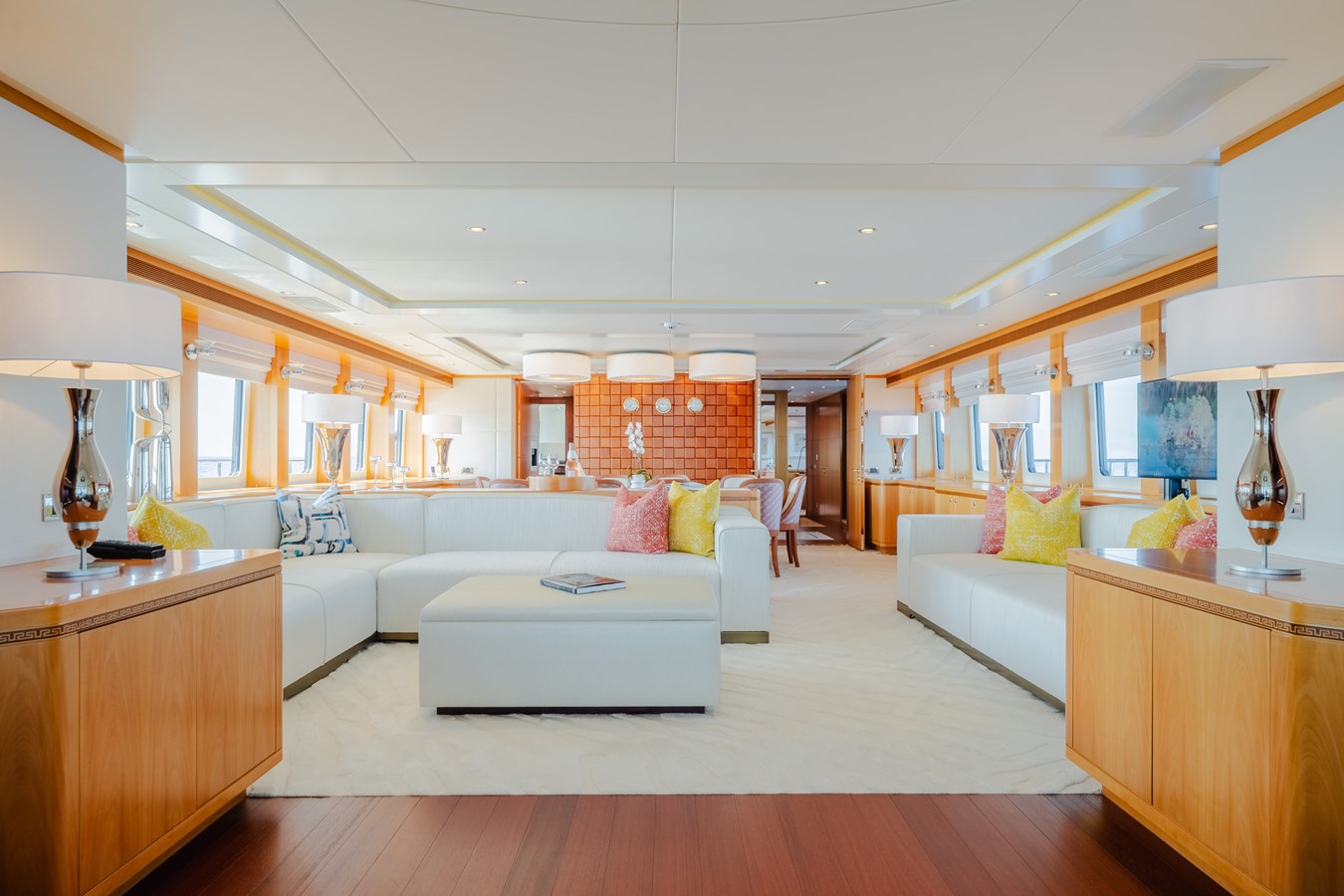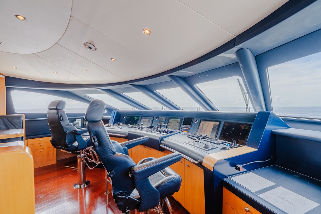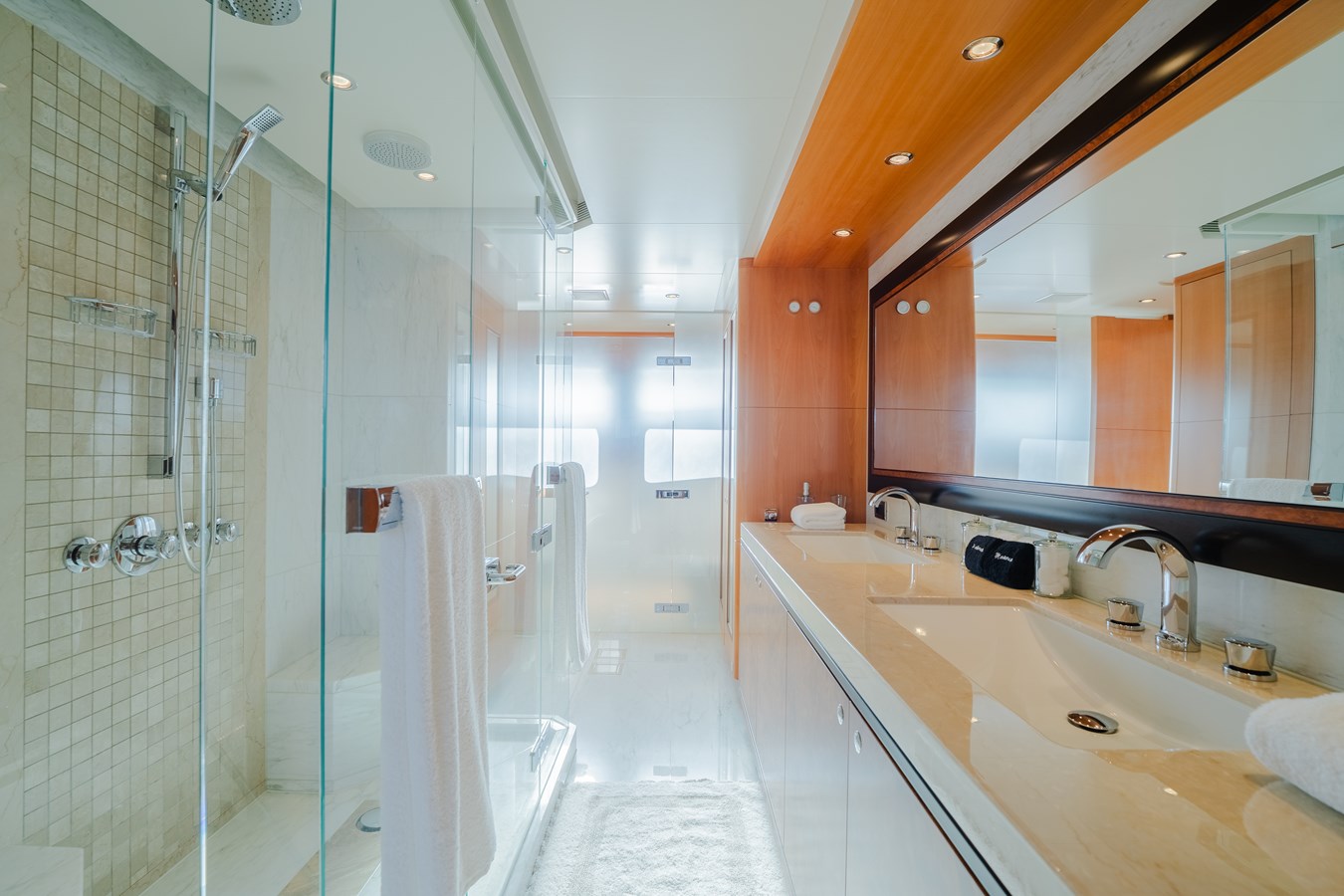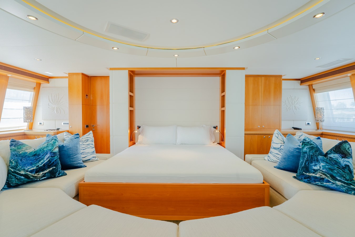 She comfortably accommodates 10 guests in five spacious ensuite staterooms, including two VIP cabins on the lower deck and a full-beam owner’s suite on the main deck. The owner’s area includes a private study, generous wardrobe space, and a luxurious bathroom with his-and-hers partitions. An optional sixth cabin is located in the skylounge, featuring a hidden queen-size Murphy bed, allowing for a total of 12 guests when desired.