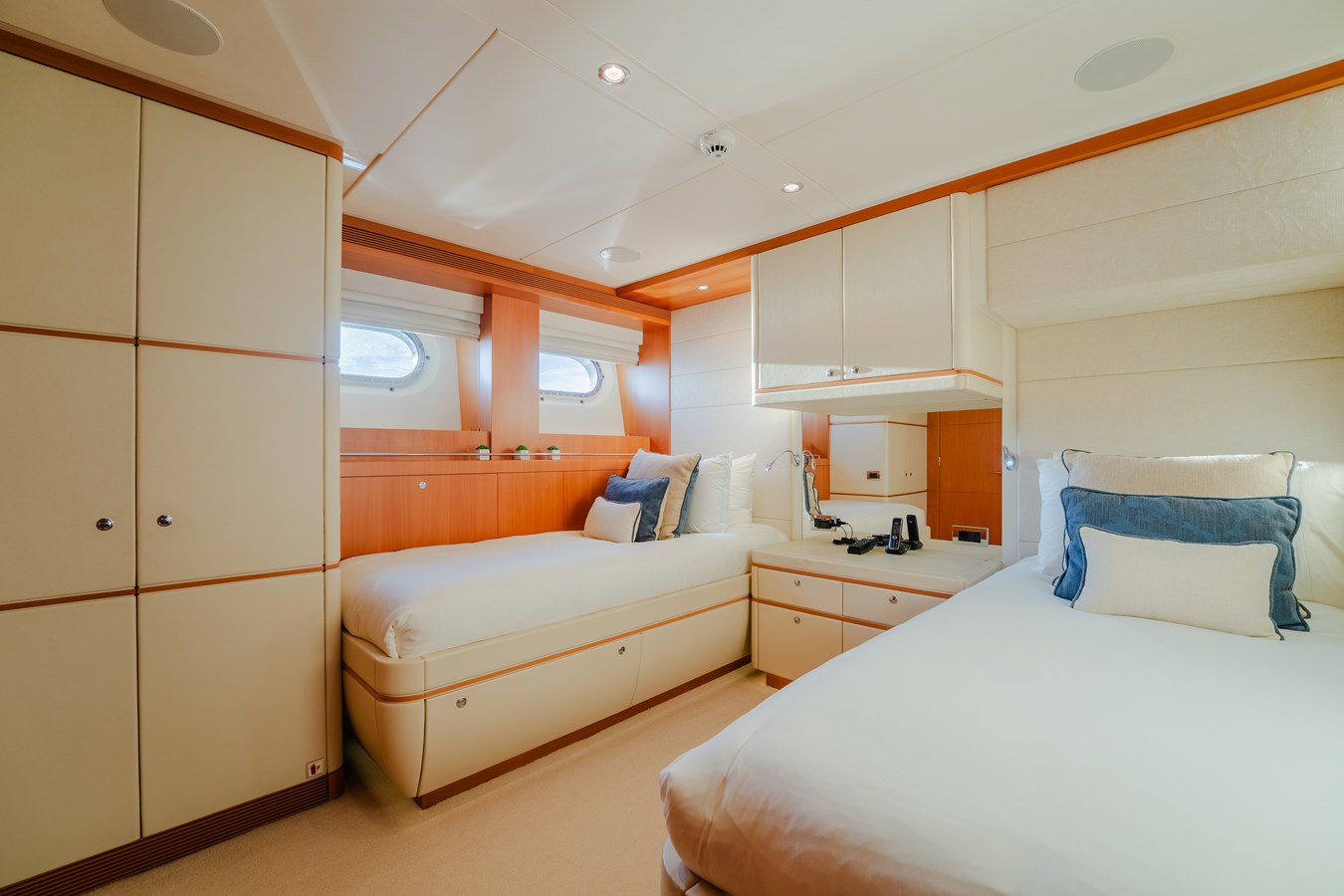 ➡️ Flexible Accommodations – Sleeps 10 guests in 5 ensuite staterooms (including a full-beam owner’s suite and 2 VIPs) with an optional 6th cabin in the skylounge for up to 12 guests.