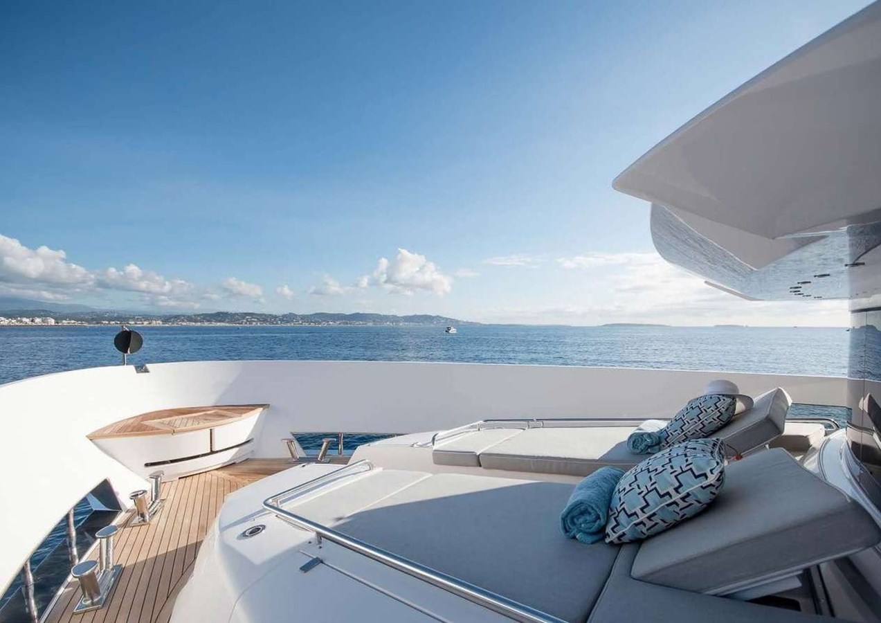 Filled with features, including a fold-down balcony on the main salon dining, panoramic views from the master cabin, a private forward lounging area forward of the master, jacuzzi on the sundeck, a back-lit onyx wall and handcrafted mosaics.