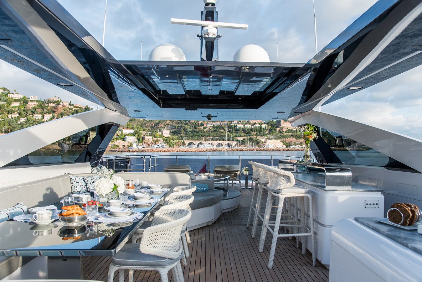 The upper deck is a superb sundeck, with full dining table, bar, jacuzzi, sunbathing area, flybridge and bridge access.