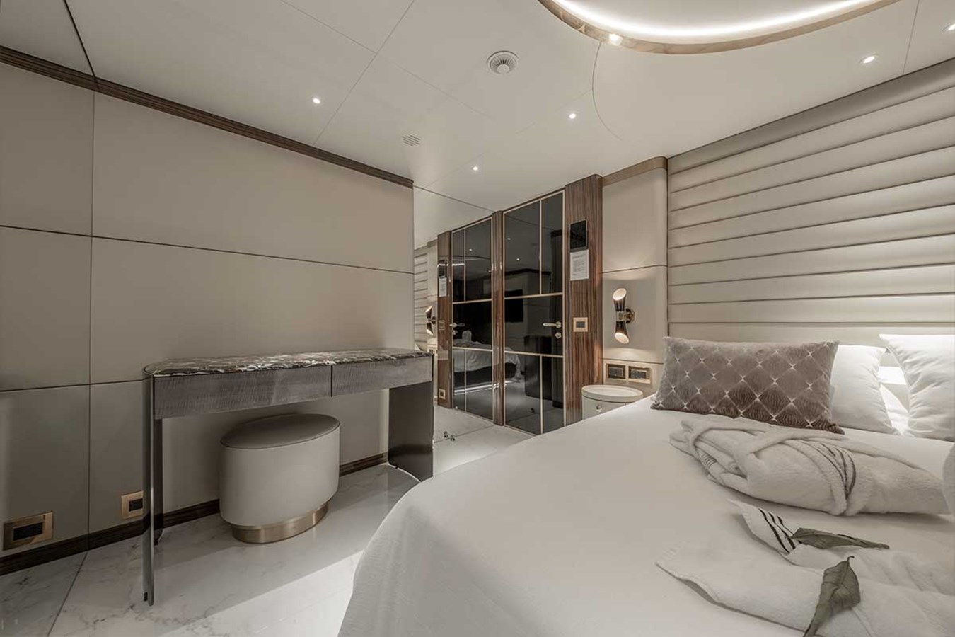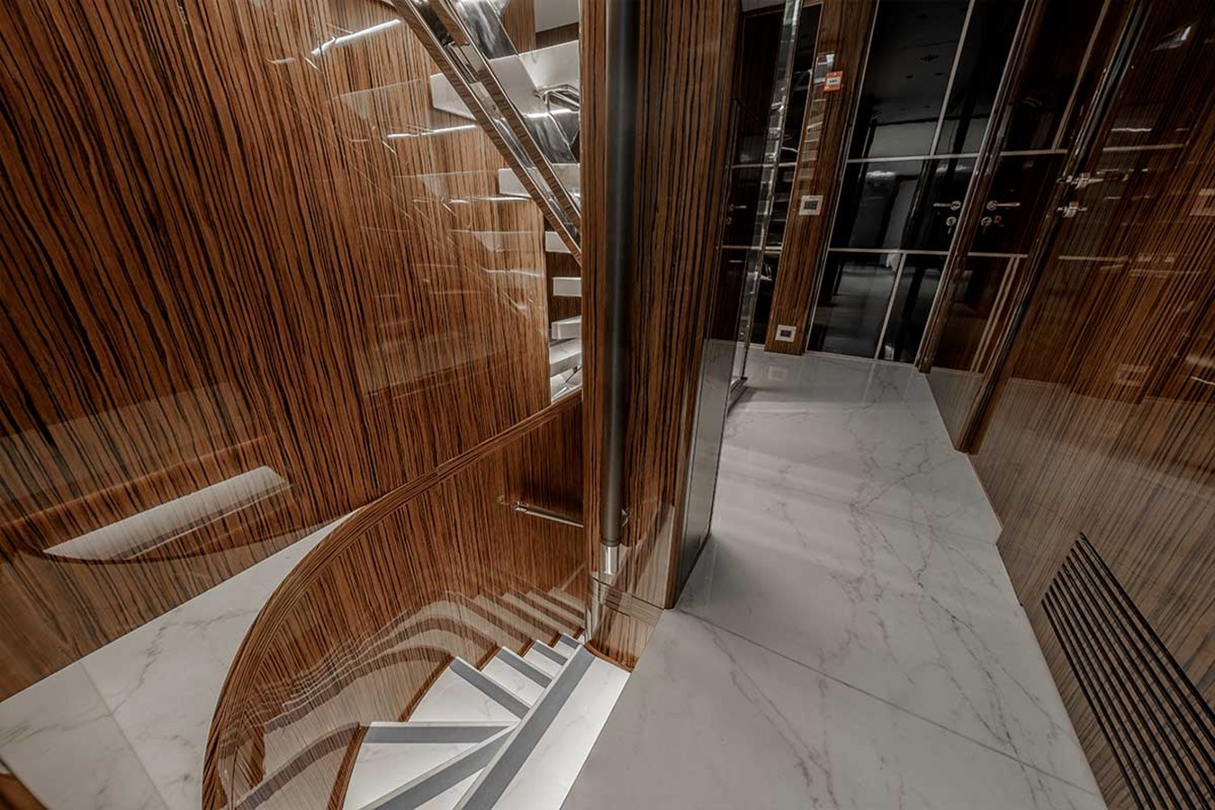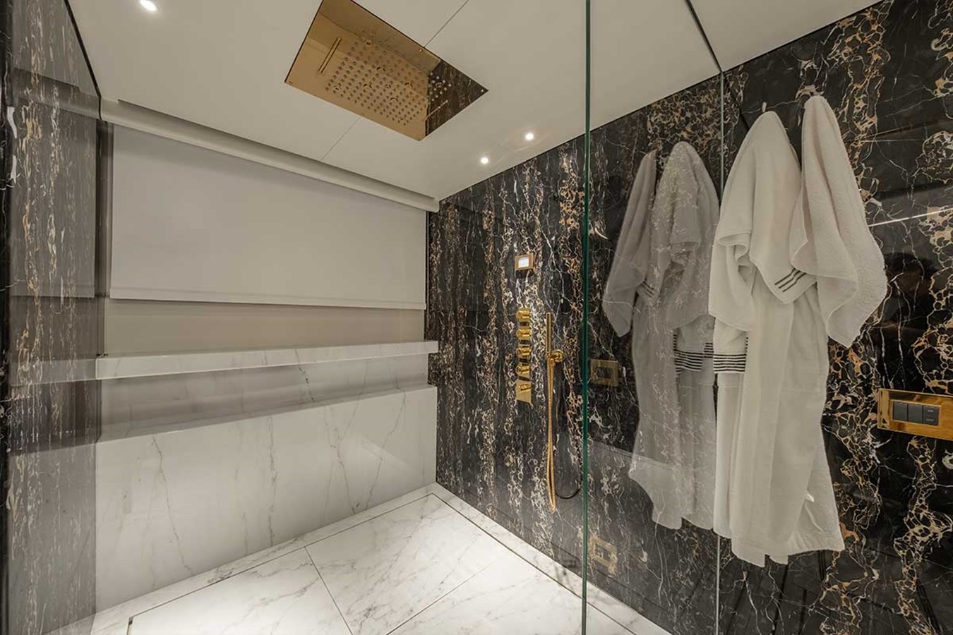 marble inside on all of the Upper deck and Main deck cabins. The yacht has