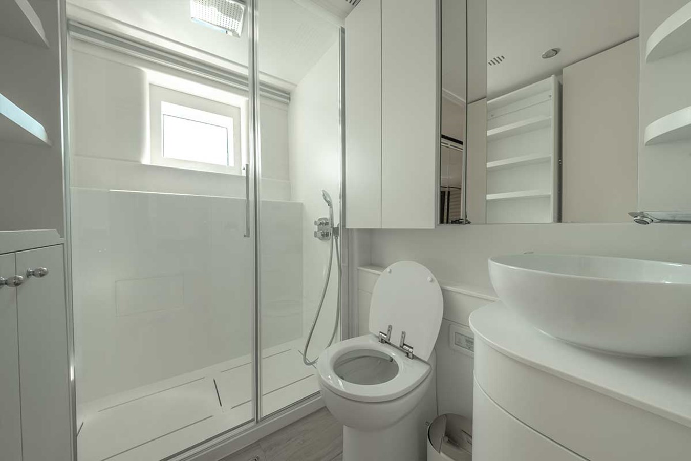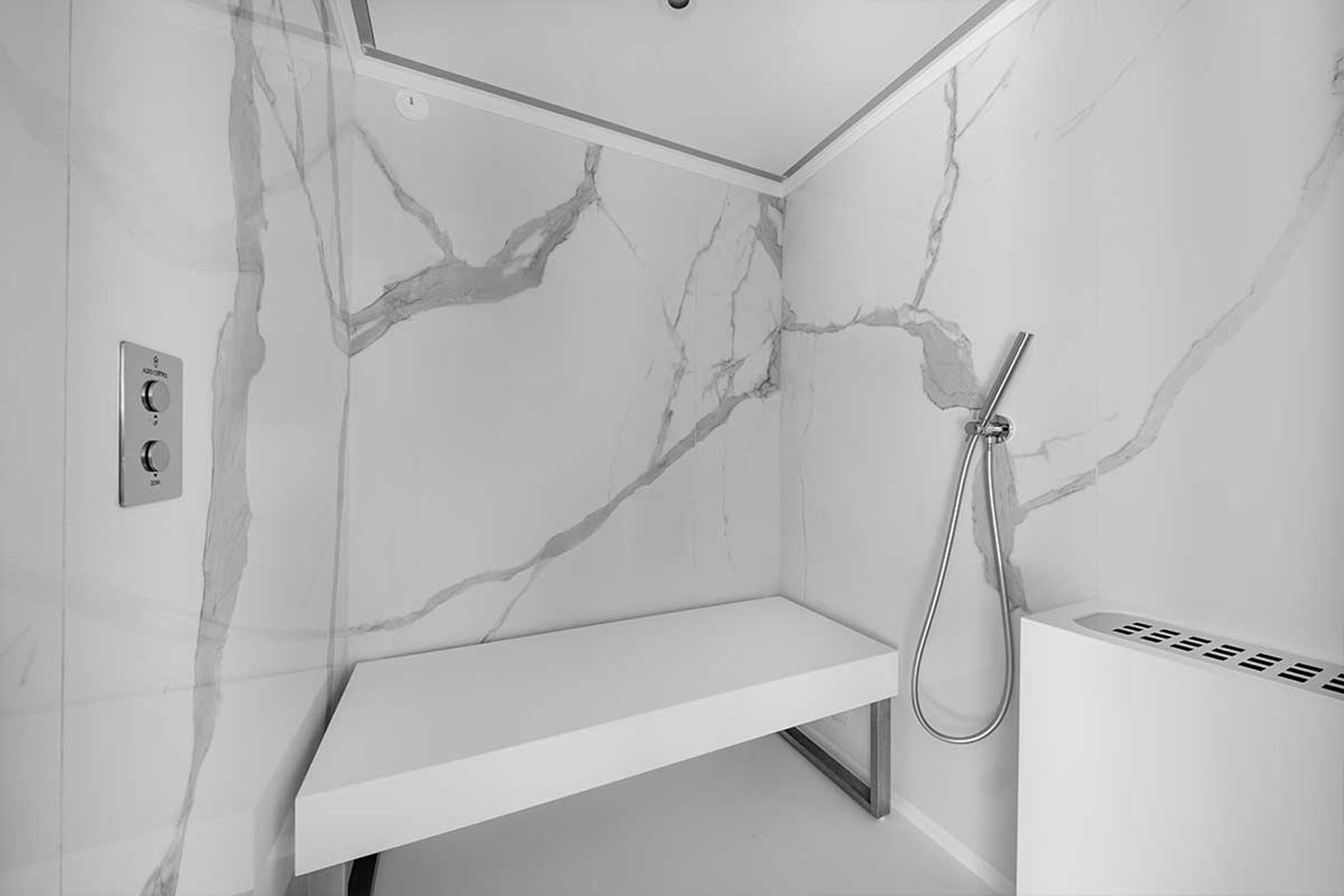 marble flooring, a fold out fully automatic balcony, an increased shower