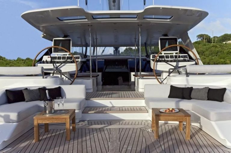 On deck, the yacht is optimized for outdoor living. The aft cockpit is sheltered for al fresco dining, while expansive lounging areas amidships and forward provide options for sunbathing or relaxing in the shade under the retractable forward canopy.