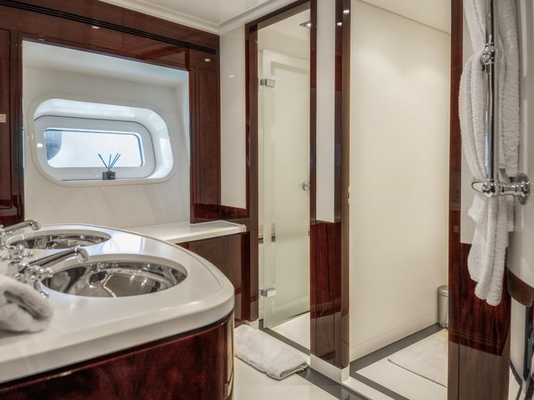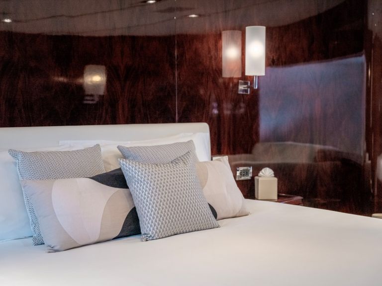 Accommodation is configured across four ensuite cabins: a full-beam master suite, two double staterooms, and one twin cabin—each appointed with premium fixtures and finishes to ensure guest comfort and privacy.