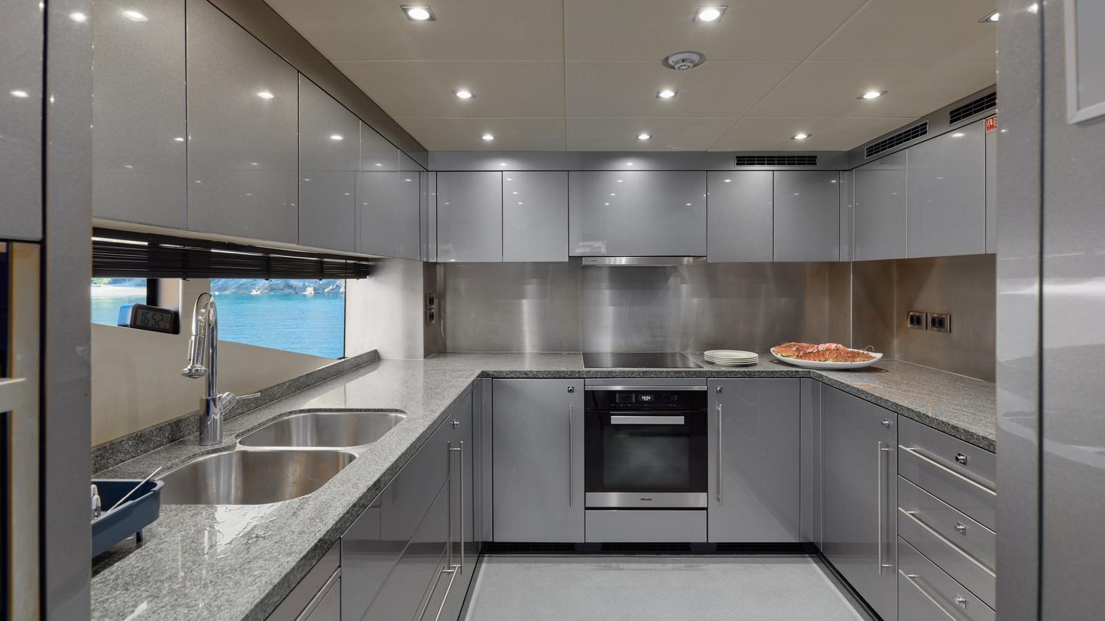 The yacht boasts expansive exterior decks, ideal for sunbathing, socializing, or simply taking in the views. The beach club provides easy access to the water, making it perfect for swimming or water sports. Zero-speed stabilizers enhance comfort at anchor, ensuring a smooth and relaxing experience in any setting. Large windows throughout and fold down balconies in the main salon flood the interior with natural light, creating an open and airy environment that seamlessly blends indoor luxury with the surrounding seascape.
