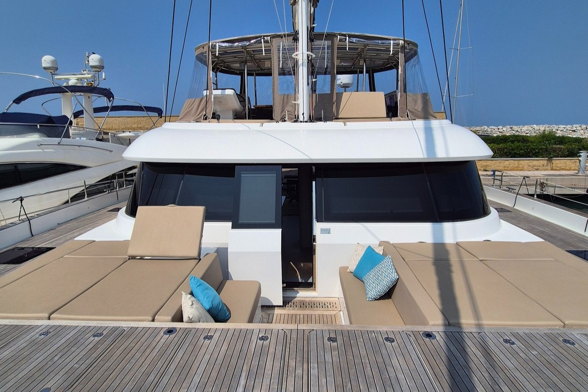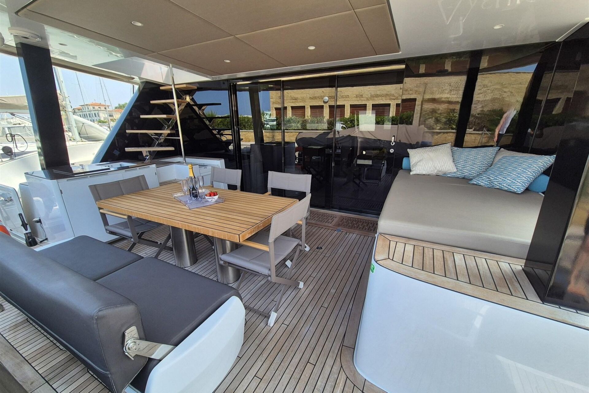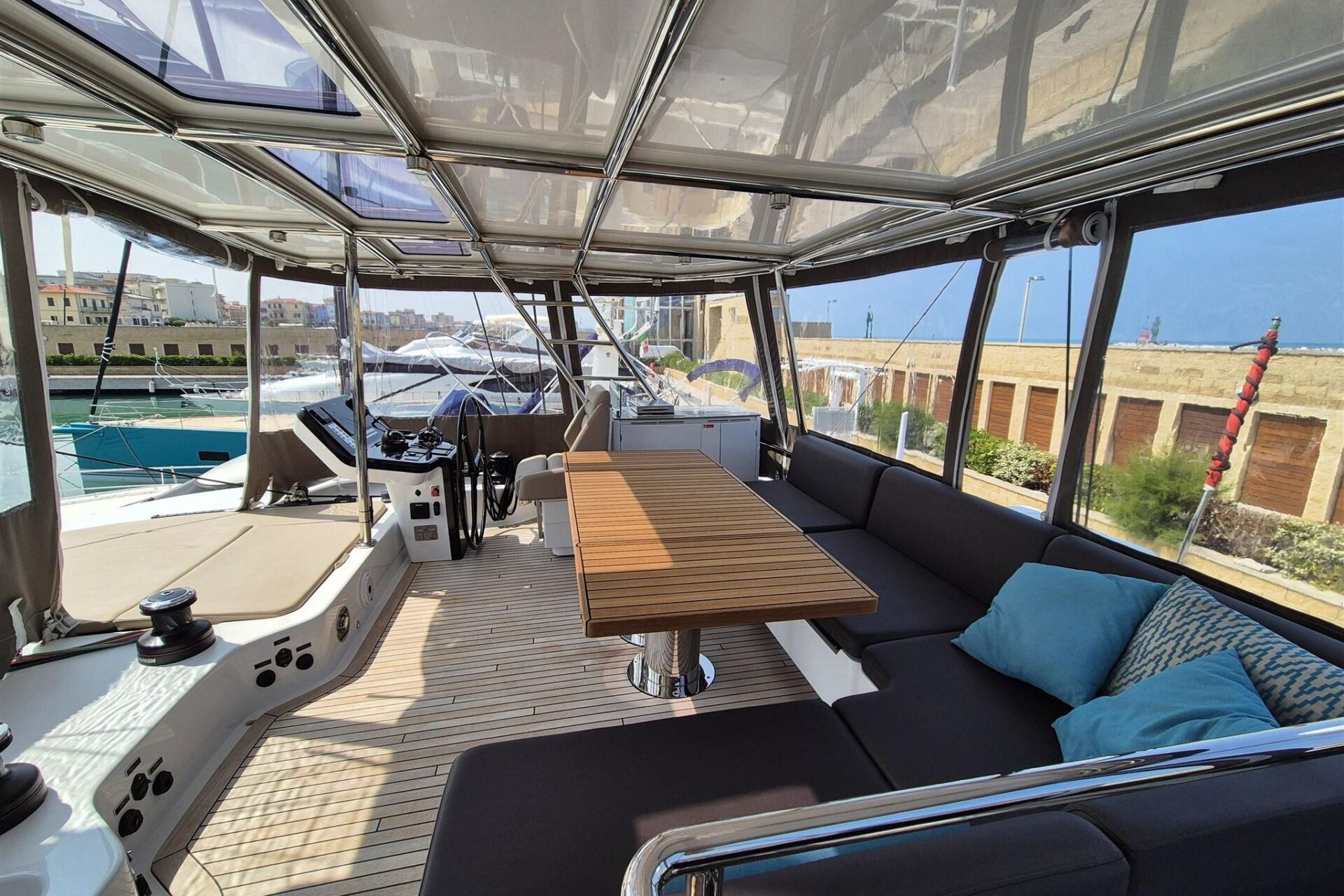 Above, the expansive flybridge hosts the main helm station and serves as a dedicated leisure area—perfect for enjoying panoramic views while under sail or at anchor.