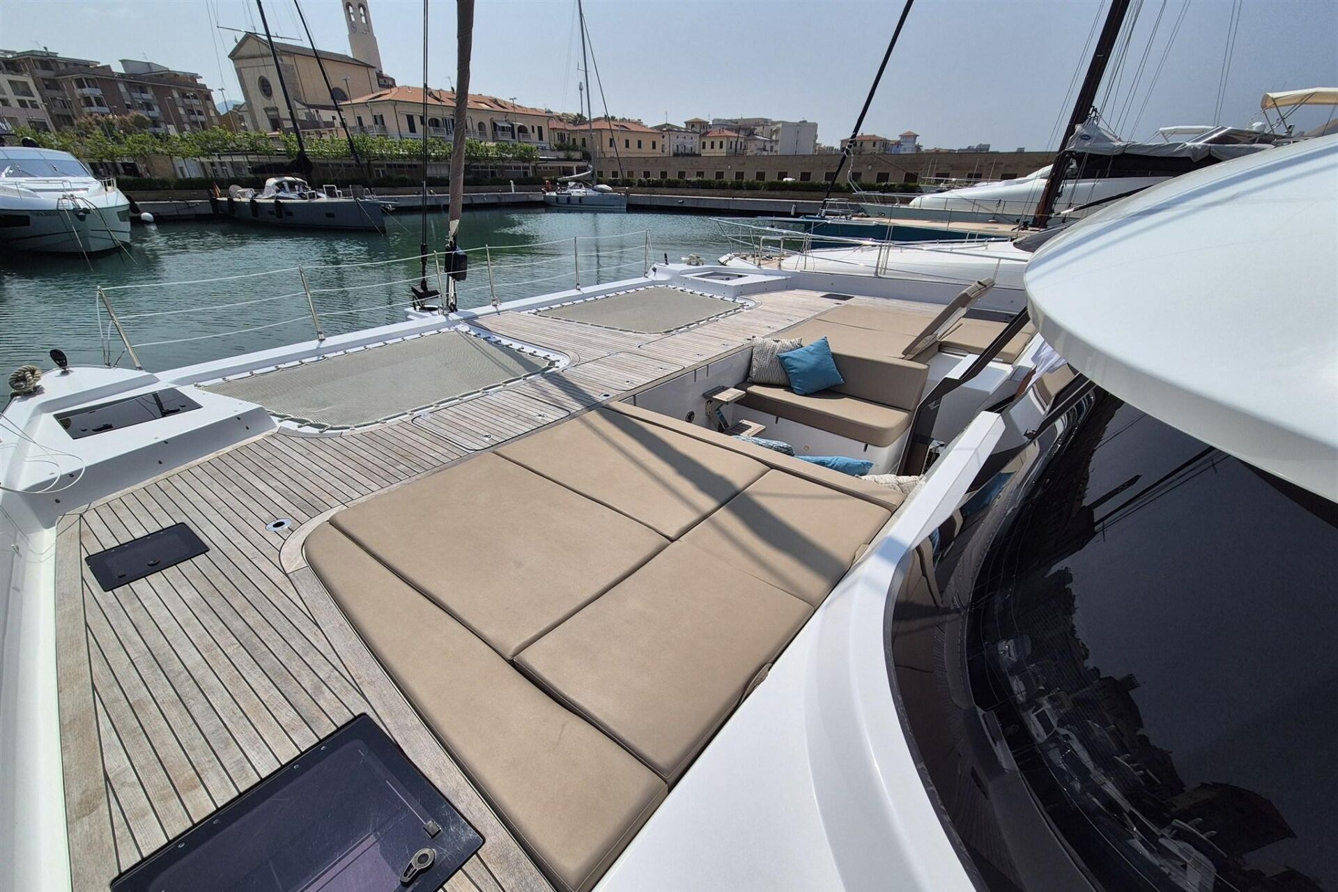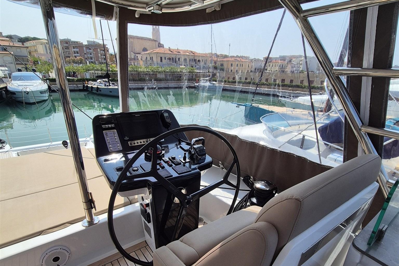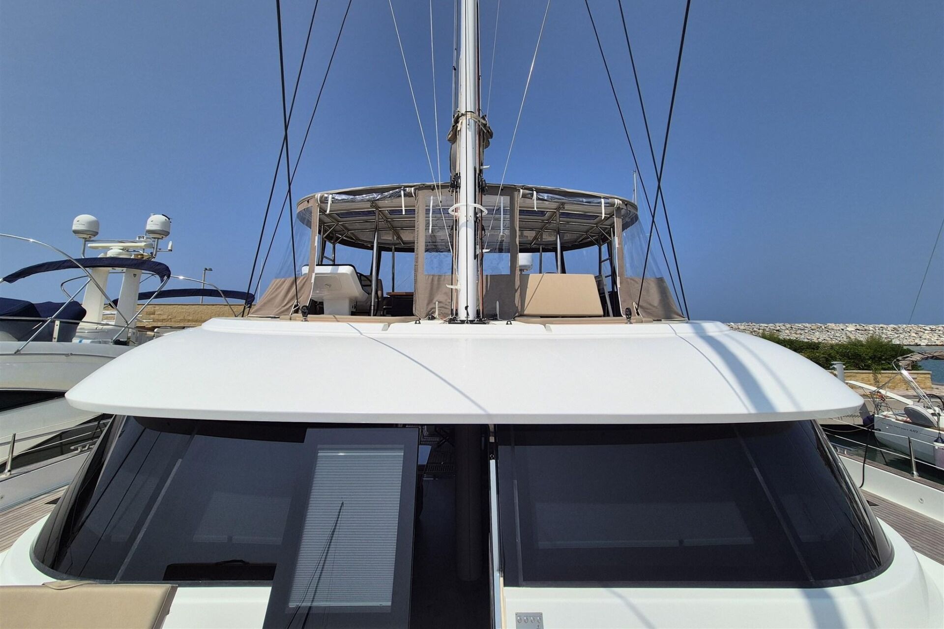 Above, the expansive flybridge hosts the main helm station and serves as a dedicated leisure area—perfect for enjoying panoramic views while under sail or at anchor.