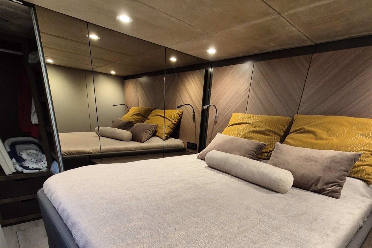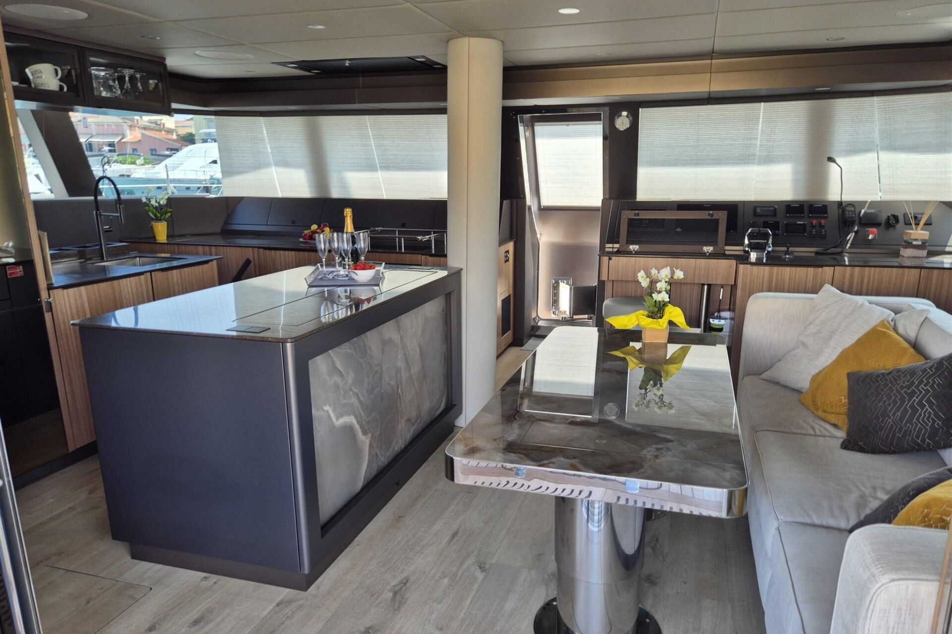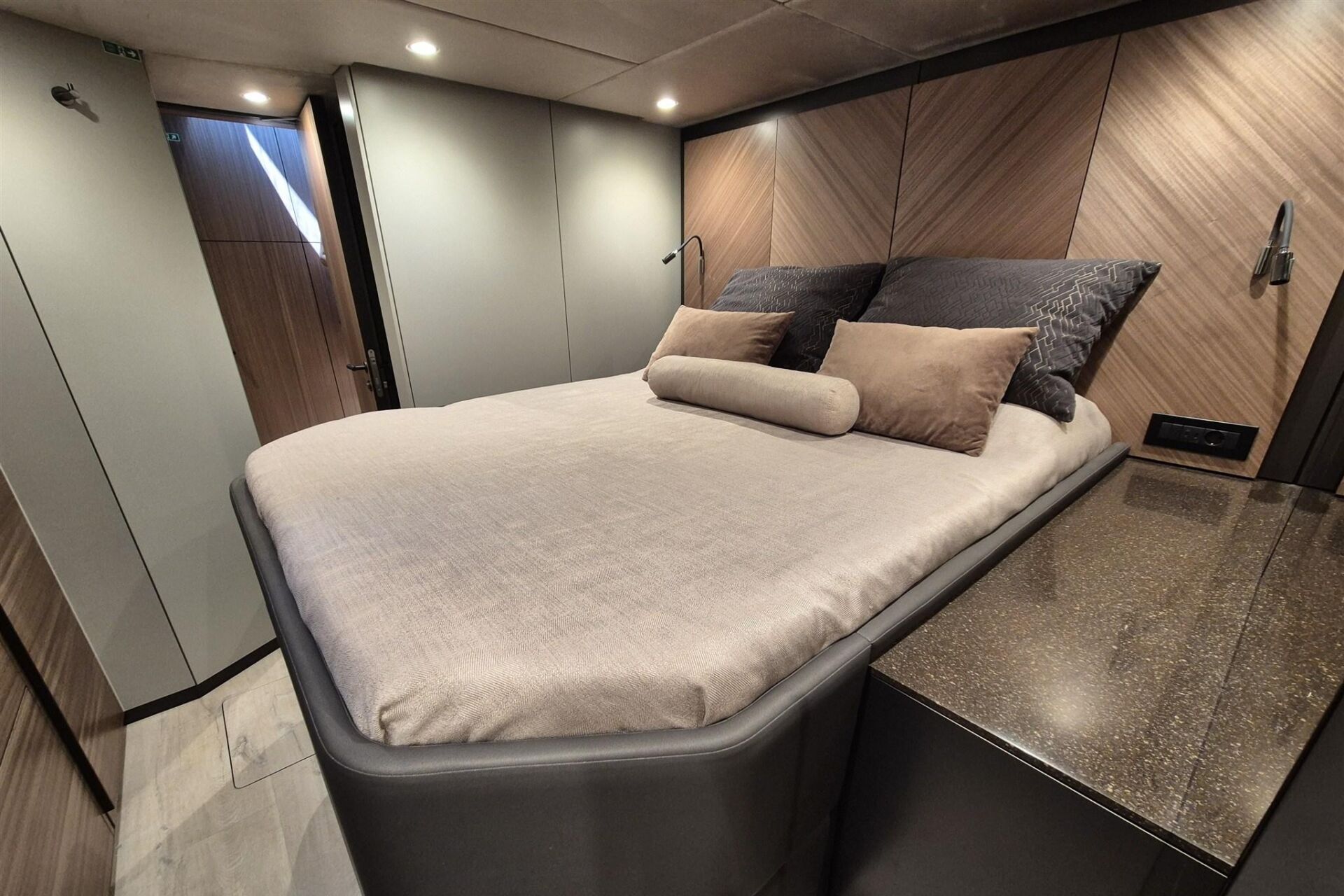 The bright, open salon connects both the foredeck terrace and the aft cockpit, which is extended by a hydraulic swim platform—ideal for relaxation or easy water access. The hulls offer generous volume, allowing for a fully customized layout which includes spacious guest cabins and a luxurious owner’s suite complete with a walk-in closet, desk, sofa, retractable TV and a large en-suite bathroom.
