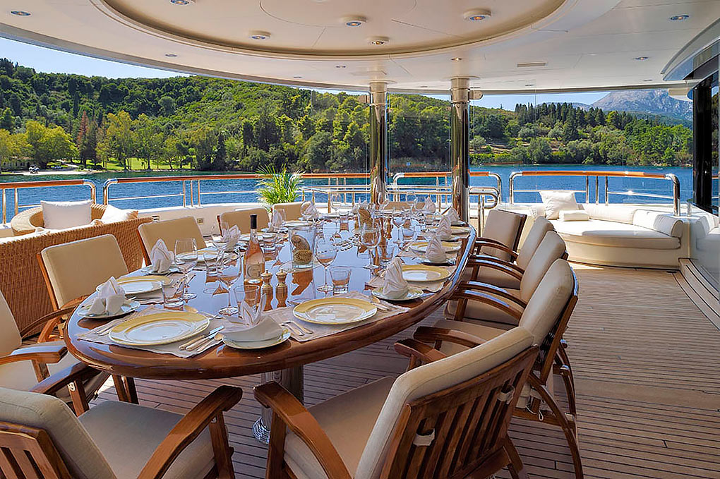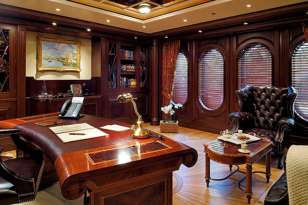The saloon turns into a disco, the skylounge converts into a cinema and the dining room has a fold out balcony. The double height master stateroom is sumptuous with a private access to a raised observation lounge and to the foredeck with cozy seating on each side. All the staterooms have large windows and heated marble floors in the luxurious ensuite bathrooms. On the upper deck is a marble steam room and an air-conditioned gym and massage room.