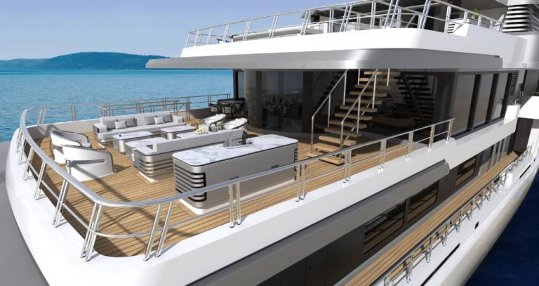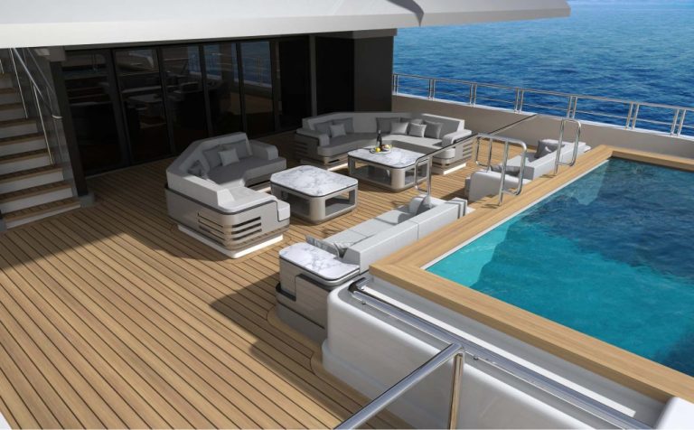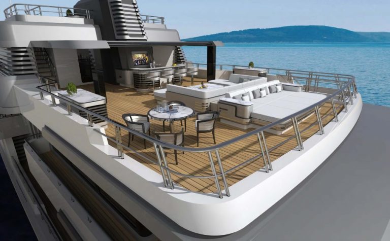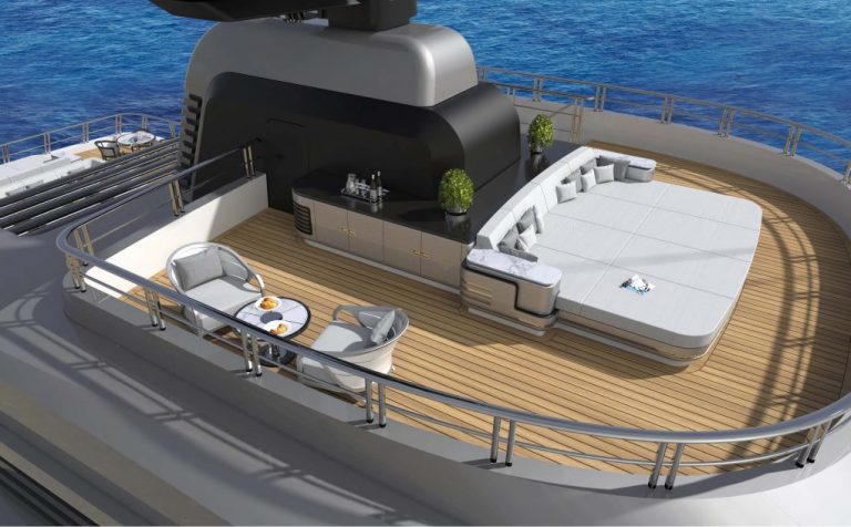 Guest accommodation will include a generous owner’s suite, two VIP staterooms and four additional guest cabins. Guests can also look forward to an onboard cinema, full beam sky lounge, and beach club with wellness centre.