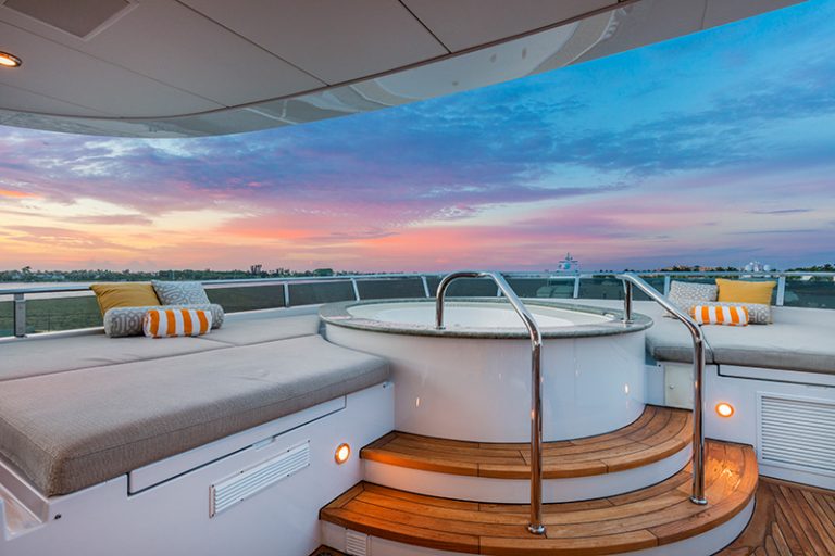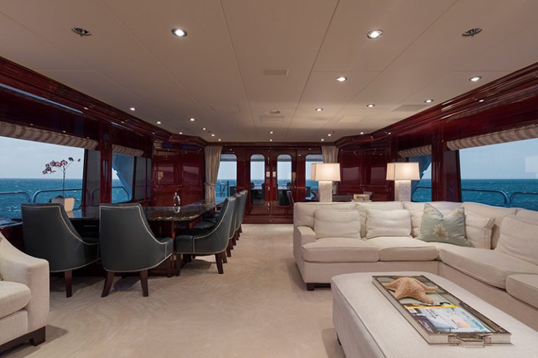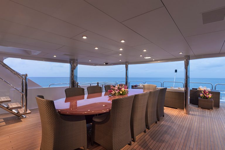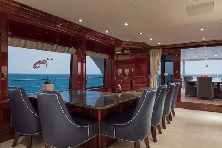The 161’ (49m) yacht CARTE BLANCHE boasts a water toys floating dock including a rare semi-submersible Seabreacher. She also delights with sun deck mini golf and bar, al fresco dining aft, and elegant interior furnishing. Both Master and VIP staterooms are full-beam with tasteful and luxurious décor.